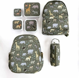 Praktiškas keturių užkandinių dėžučių rinkinys keturių dydžių su savanos gyvūnų motyvais. Dėžutės lengvai atsidaro, jas galima sudėti vieną į kitą vietos taupymui ir jos puikiai tinka pietums bei užkandžiams darželiui, mokyklai ar išvykoms.