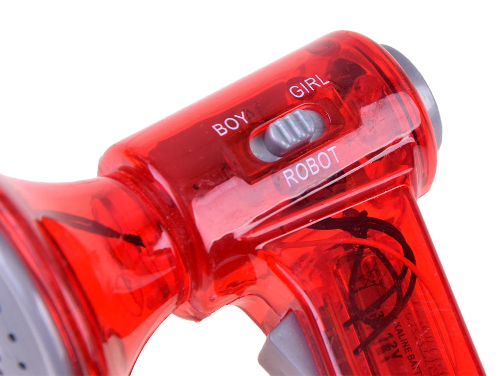 Balso keitiklis maitinamas 1x12V baterija (įtraukta į rinkinį), o jo ergonomiškas dizainas leidžia lengvai naudotis net ir mažesniems vaikams. Lengvo plastiko korpusas užtikrina saugumą ir paprastą naudojimą.