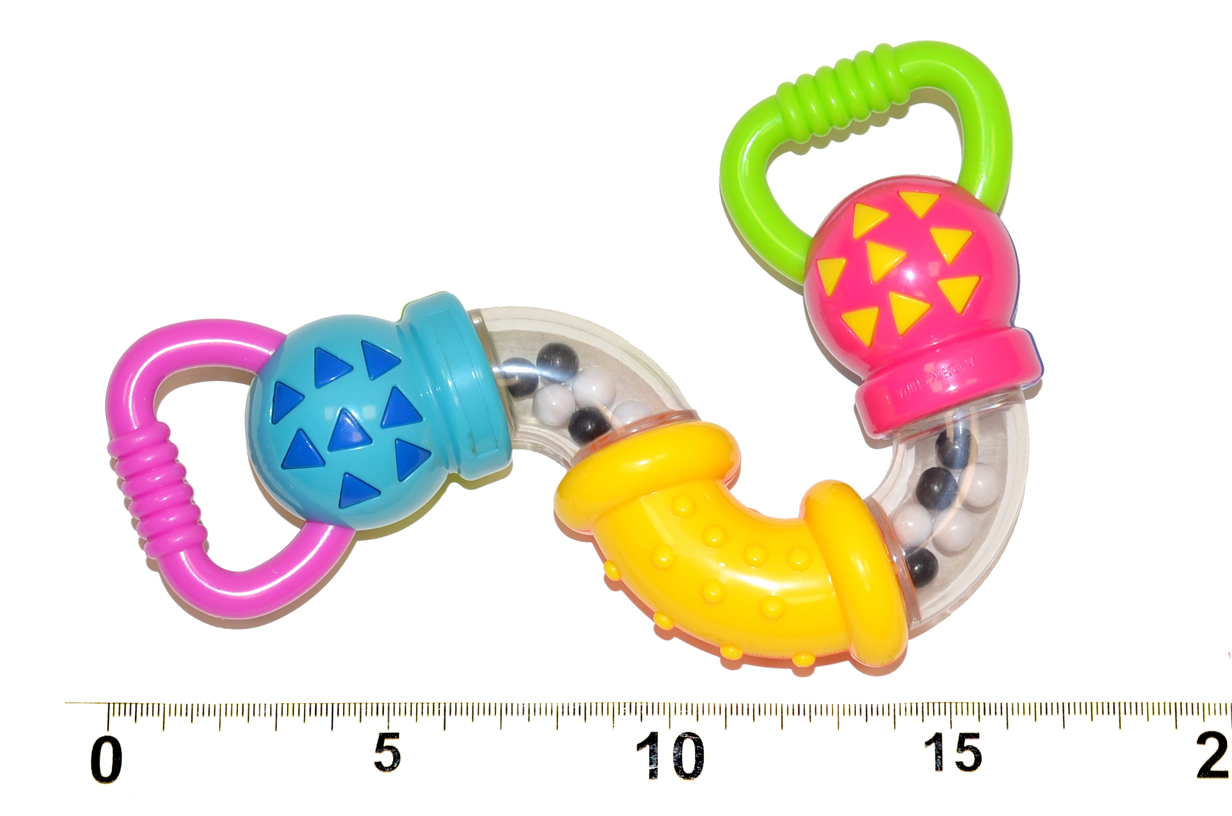 Spalvingas barškutis patiems mažiausiems skatina pojūčių ir smulkiosios motorikos vystymąsi. Dėl besisukančių vamzdelių ir barškančių kamuoliukų skleidžia malonius garsus, turi patogias rankenėles lengvam laikymui ir dydį, idealų vaiko delneliui.