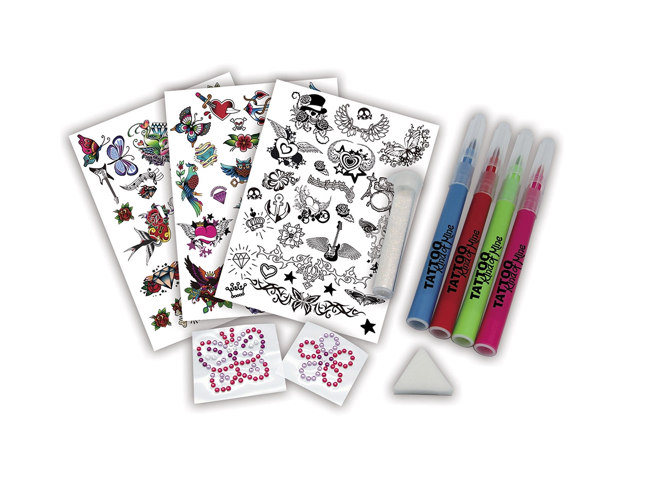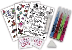 Sukurkite savo originalias tatuiruotes arba pabandykite atkurti mėgstamus motyvus. Rinkinys lengvai naudojamas ir smagus bet kokia proga.