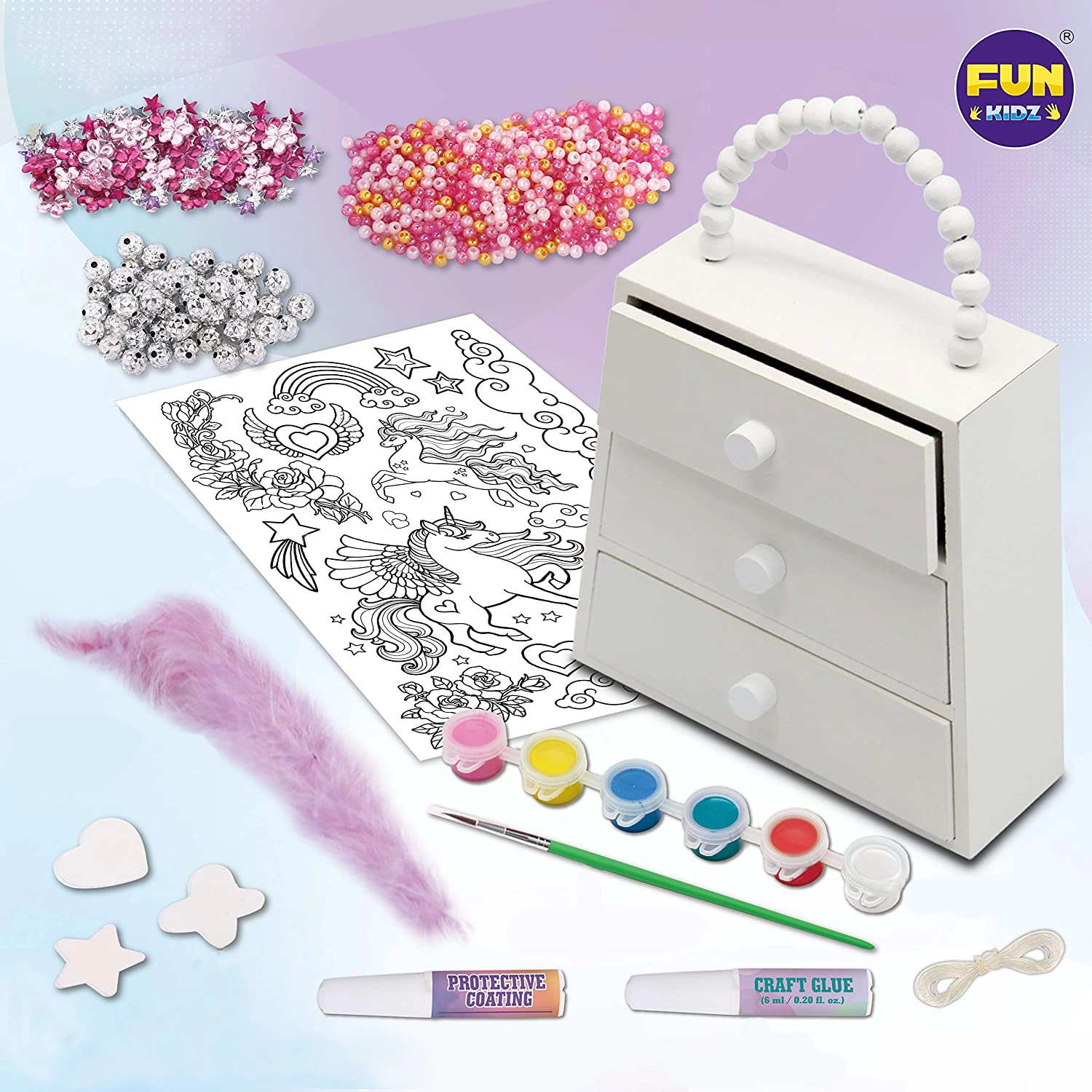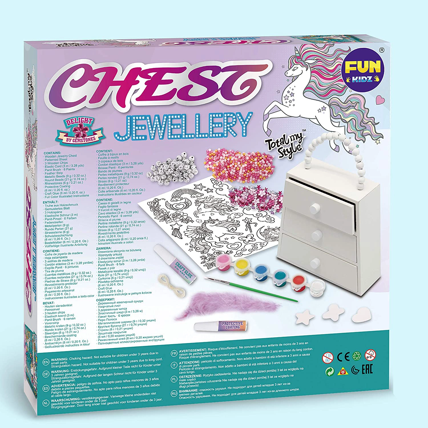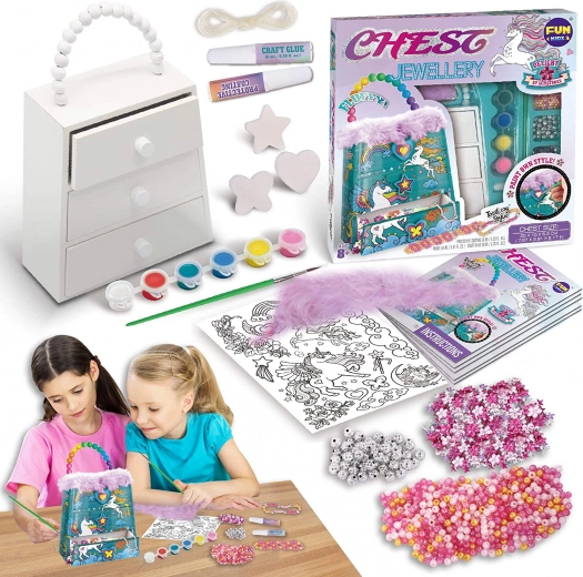 - Rinkinyje yra medinė papuošalų dėžutė, teptukas, 6 dažai, virvelė, klijai ir plati dekoracijų įvairovė.
