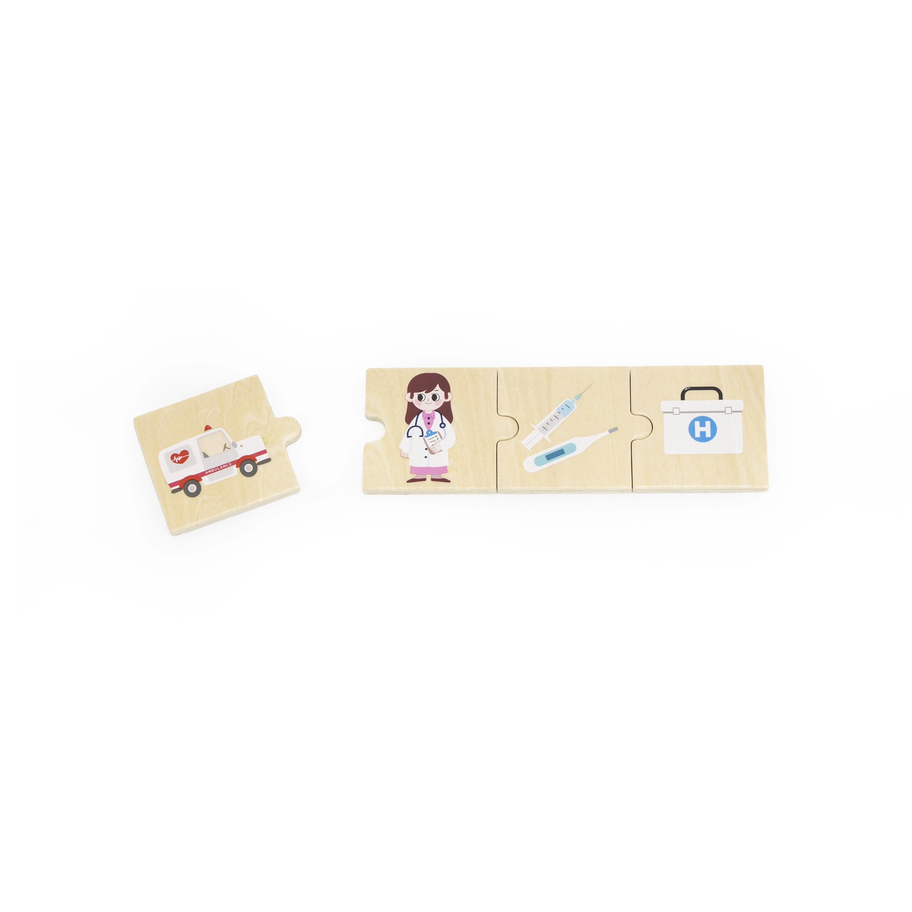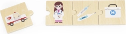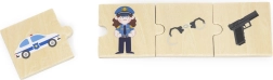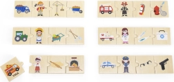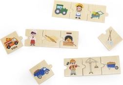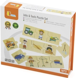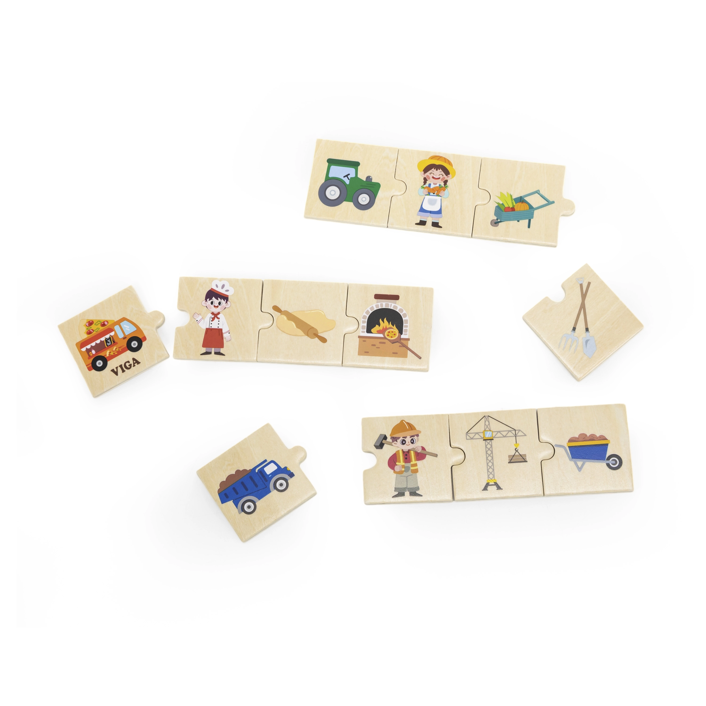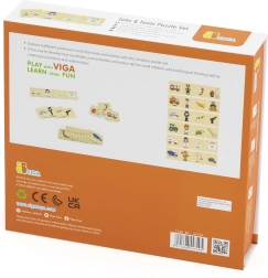 VIGA edukacinis rinkinys vaikams pateikia 24 medines detales su gražiomis iliustracijomis, padedančiomis žaismingai susipažinti su 6 profesijomis – pavyzdžiui, gaisrininku, gydytoju, policininku, ūkininku, statybininku ar kepėju – ir priskirti joms tinkamus įrankius bei transporto priemones. Ryškūs paveikslėliai skatina mokytis naujų žodžių ir plėsti žodyną.