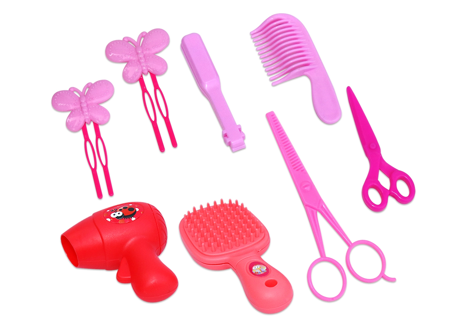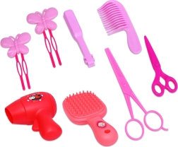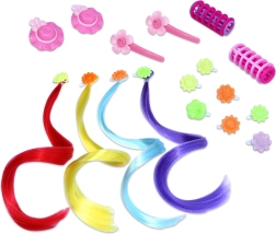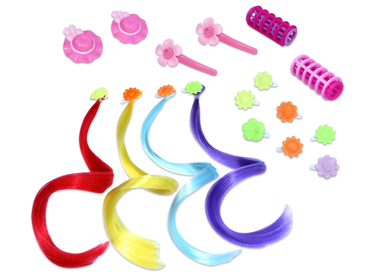 • Visas priedų rinkinys – šukos, „garbanojimo žnyplės“, segtukai ir spalvotos sruogos.