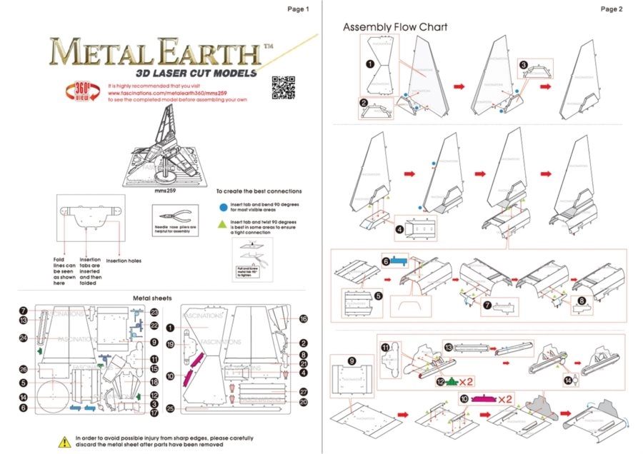 Rinkinyje yra 2 plieniniai lakštai su detalėmis ir iliustruotas vadovas. Surinkimas vyksta be klijų – detalės jungiamos užraktais ir lenkiamais liežuvėliais. Rekomenduojama naudoti mažas replutes ir kirptuves (nėra komplekte).
