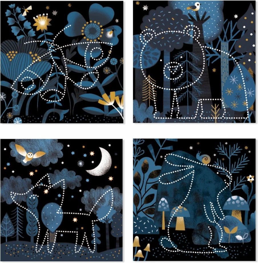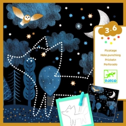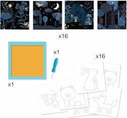 Pakuotėje rasite viską, ko reikia: 16 iliustruotų fonų, 16 trafaretų, skylamušio adatą, tvirtą laikiklį ir iliustruotą knygelę su instrukcijomis. Medžiagos pagamintos iš popieriaus ir kartono su FSC sertifikatu, tad kūryba yra ne tik įkvepianti, bet ir draugiška gamtai.
