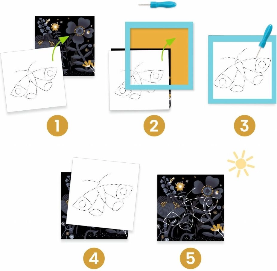 Atraskite smagią veiklą, įkvėptą Montessori metodikos. Vaikai saugiai lavina susikaupimą, tikslumą ir spaudimo jėgą kurdami gražius prasišviečiančius paveikslėlius. Tvirtas putų ir kartono laikiklis stabiliai laiko pagrindus, todėl mažiesiems kūrėjams dirbti lengva ir užtikrintai.