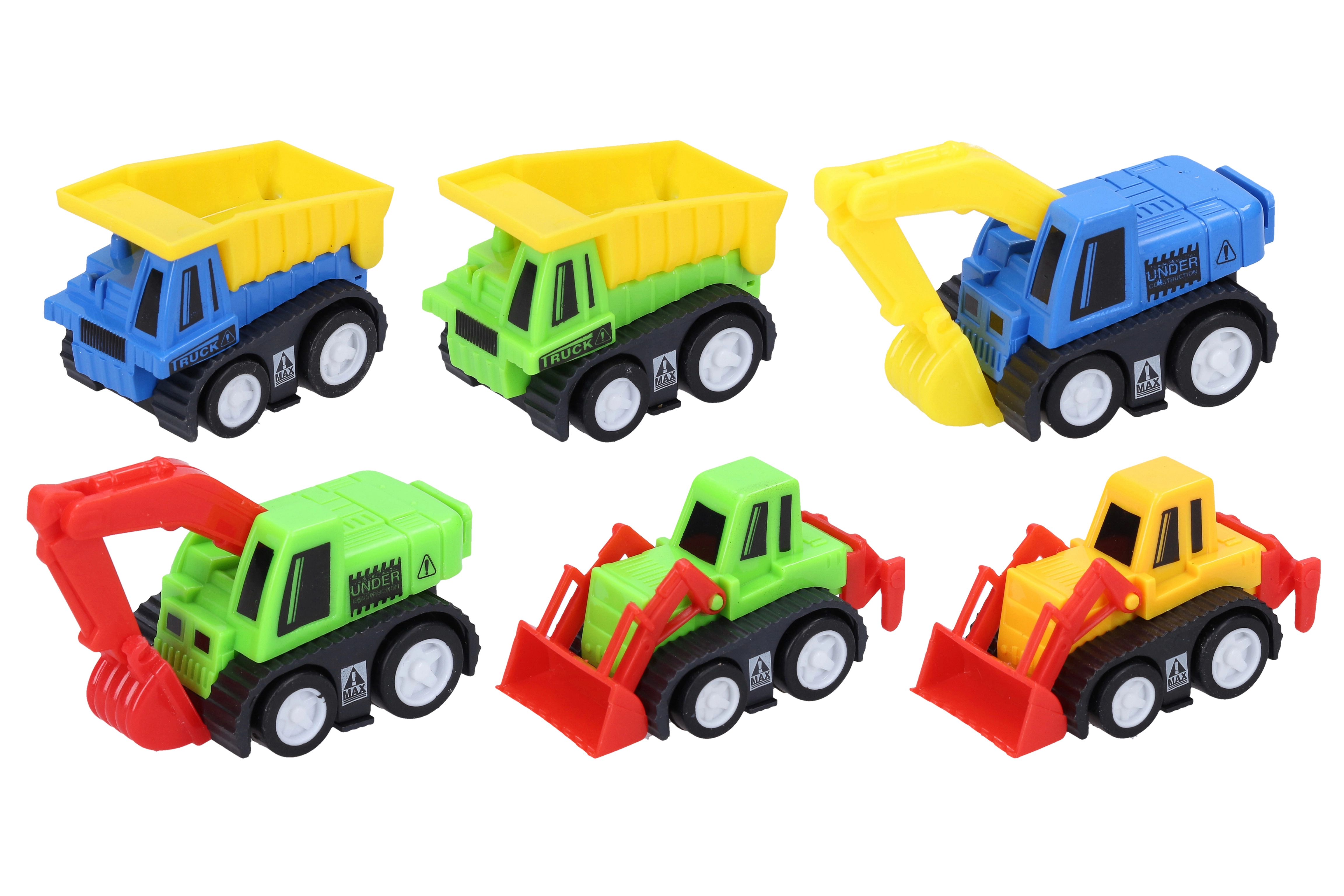 Šešių plastikinių statybinių automobiliukų rinkinys su atbuline eiga pradžiugins visus mažus statybininkus. Dėl kompaktiško 6 cm dydžio jie puikiai telpa į vaiko ranką, o darbai „statybose“ su šiais mažais pagalbininkais eis kaip per sviestą!