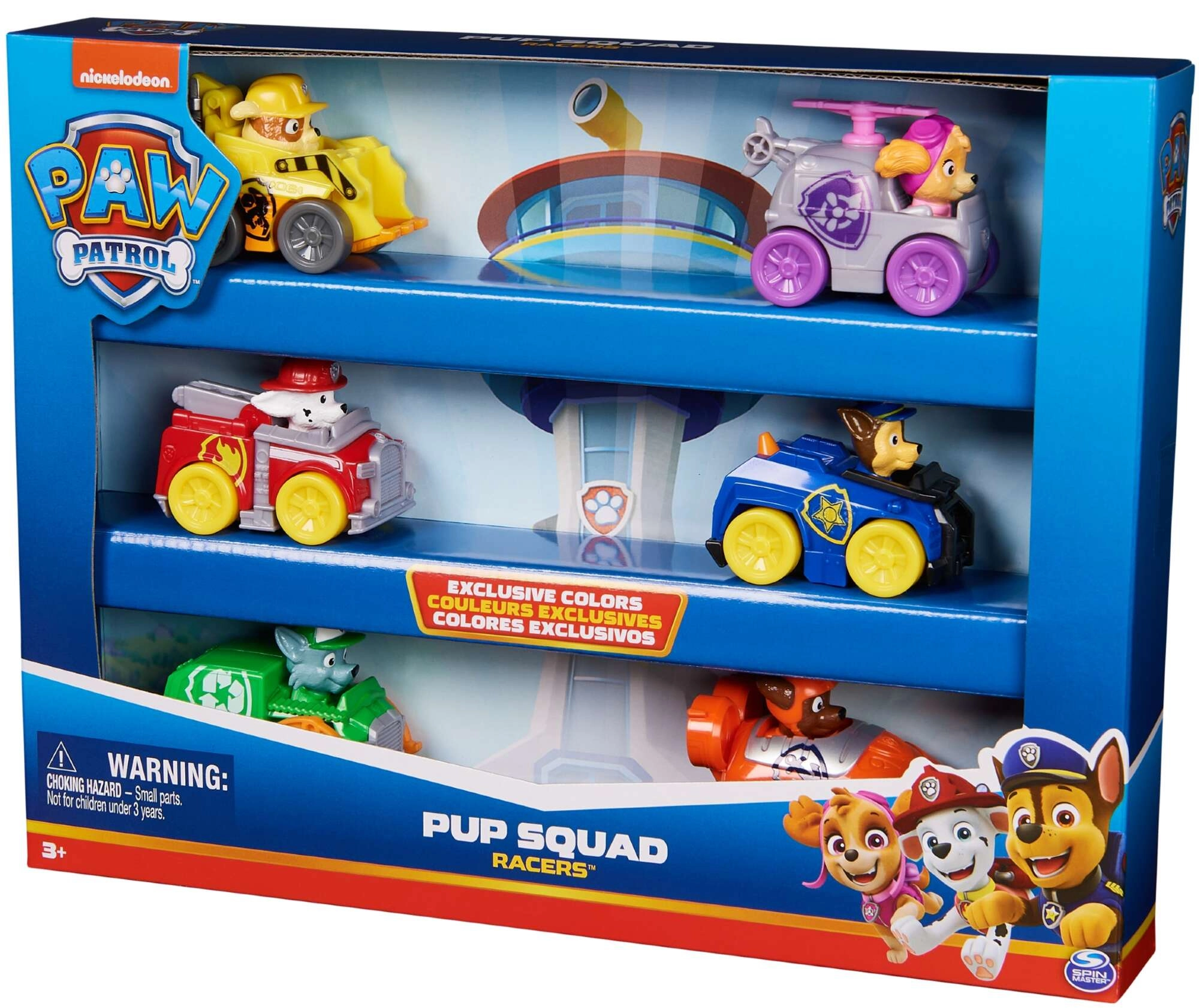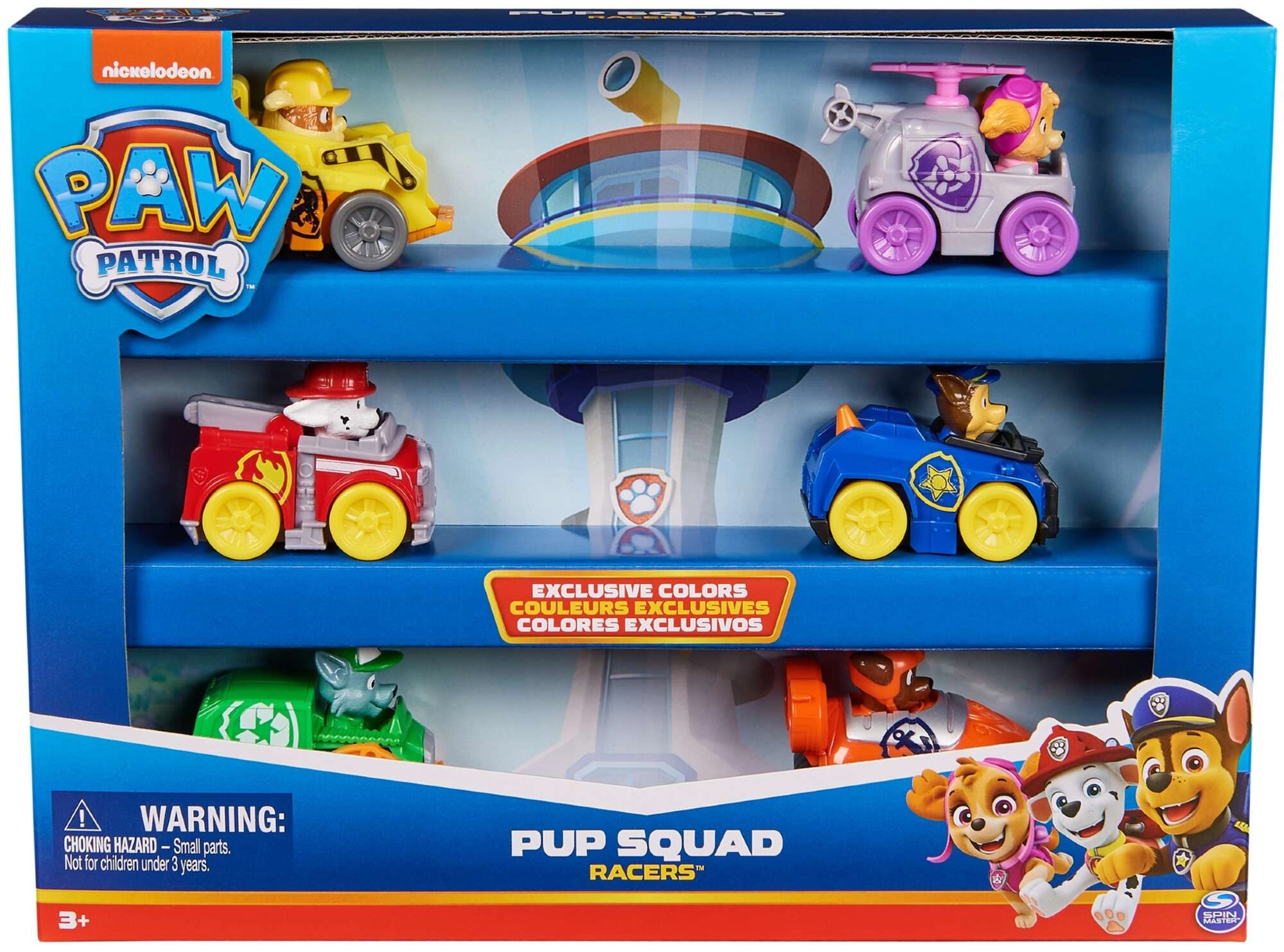 Pup Squad Racers rinkinys pristato šešias detaliai pagamintas transporto priemones su tvirtai pritvirtintomis PAW Patrol herojų figūrėlėmis – Chase, Marshall, Skye, Rocky, Rubble ir Zuma. Automobiliukai pagaminti iš patvaraus plastiko, važiuoja pastūmus, o dėl mažų matmenų juos lengva valdyti ir nešiotis.