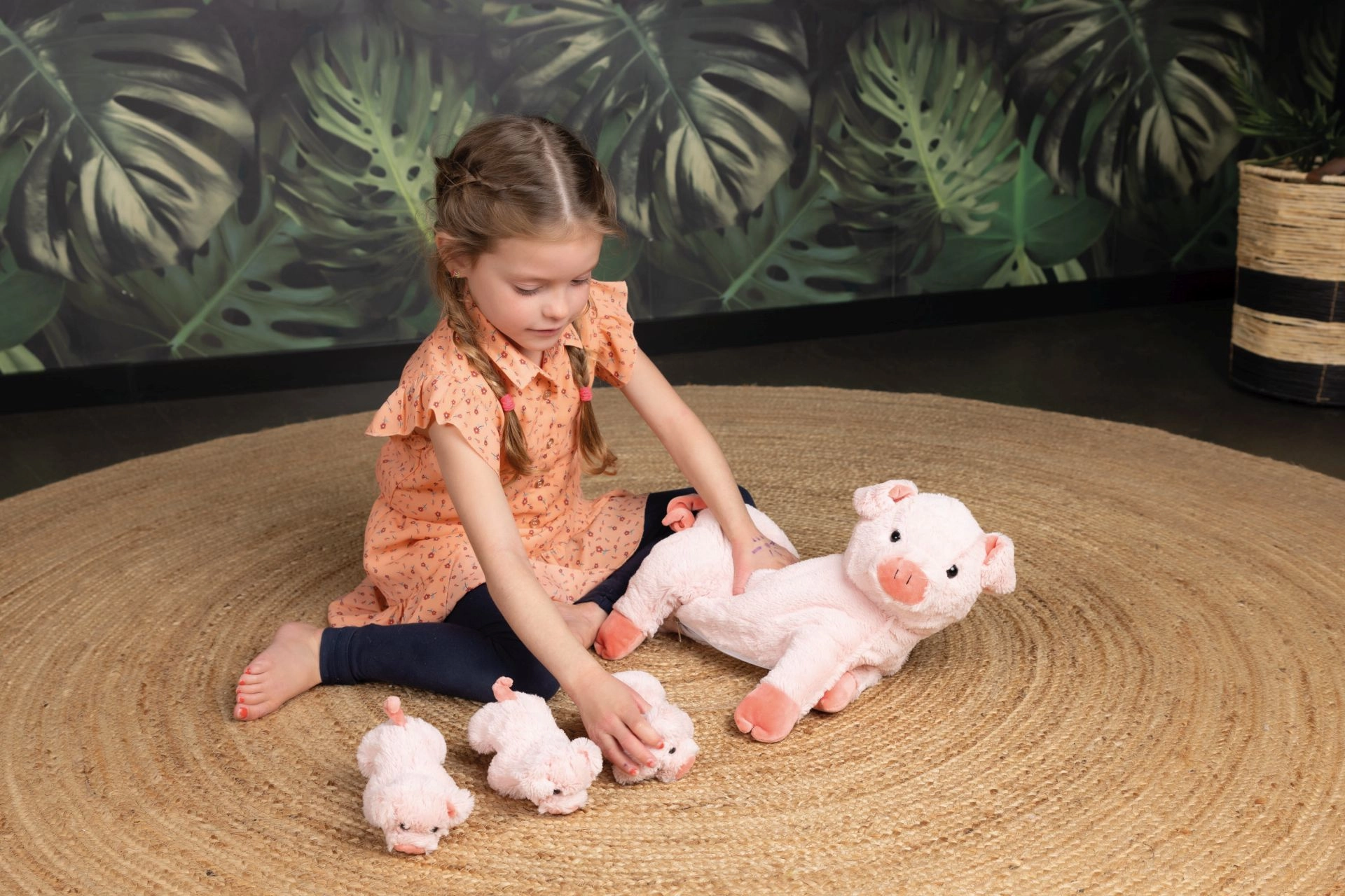 Pliušinių žaislų rinkinys Paršeliukai su Mama pasižymi labai minkšta ir malonia medžiaga, idealia apkabinimams ir žaidimams. Mama pilvelyje turi praktišką užtrauktuką, kuriuo galima atverti viduje pasislėpusius mažus paršeliukus – tai puikiai lavina vaikų emocijas ir globos įgūdžius. Ši funkcija taip pat patogi kelionėse, nes jaunikliai gali būti saugiai paslėpti.