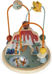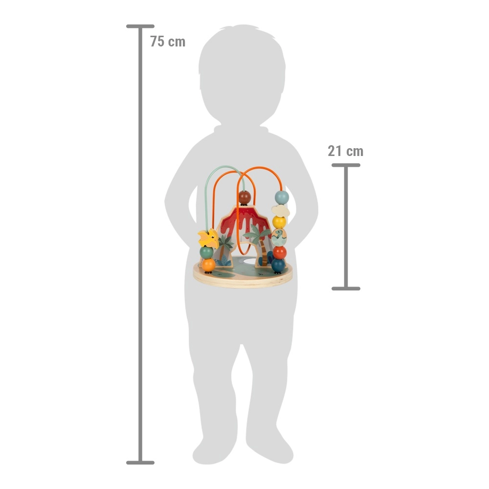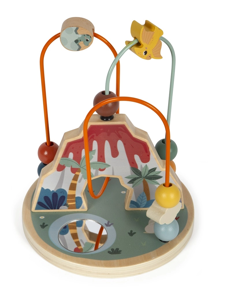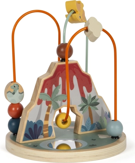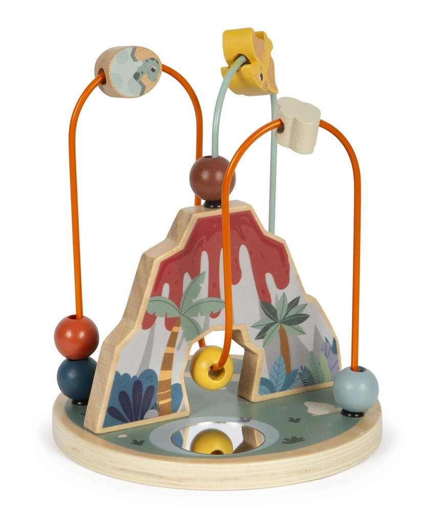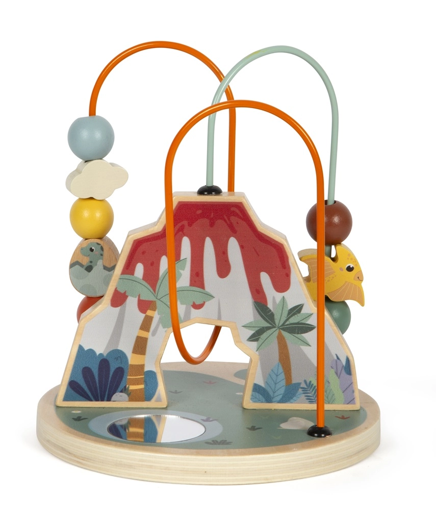 Šis karoliukų labirintas su dinozaurų motyvu yra idealiai tinkamas vaikų raidai. Moko rankos ir akies koordinacijos bei skatina kūrybiškumą, o išskirtinis ugnikalnio motyvas patraukia dėmesį. Žaislas turi dvi spalvotas kilpas su įvairiais karoliukais ir centrinį veidrodėlį pagrinde, kad viską būtų galima pamatyti iš kito kampo.