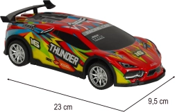 Stilingas raudonas RC automobilis THUNDER, skirtas vaikams nuo 6 metų, siūlo greitą ir smagų važiavimą namuose ir lauke. Dėl LED žibintų, gumininių padangų ir 3,7 V akumuliatoriaus tai idealus pasirinkimas pradedantiesiems lenktynininkams. Intuityvus pultelis užtikrina lengvą manevravimą, o kompaktiški matmenys 23 × 9,5 × 5 cm tinka kiekvienai vaiko rankai.