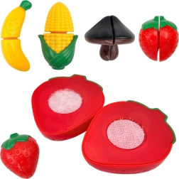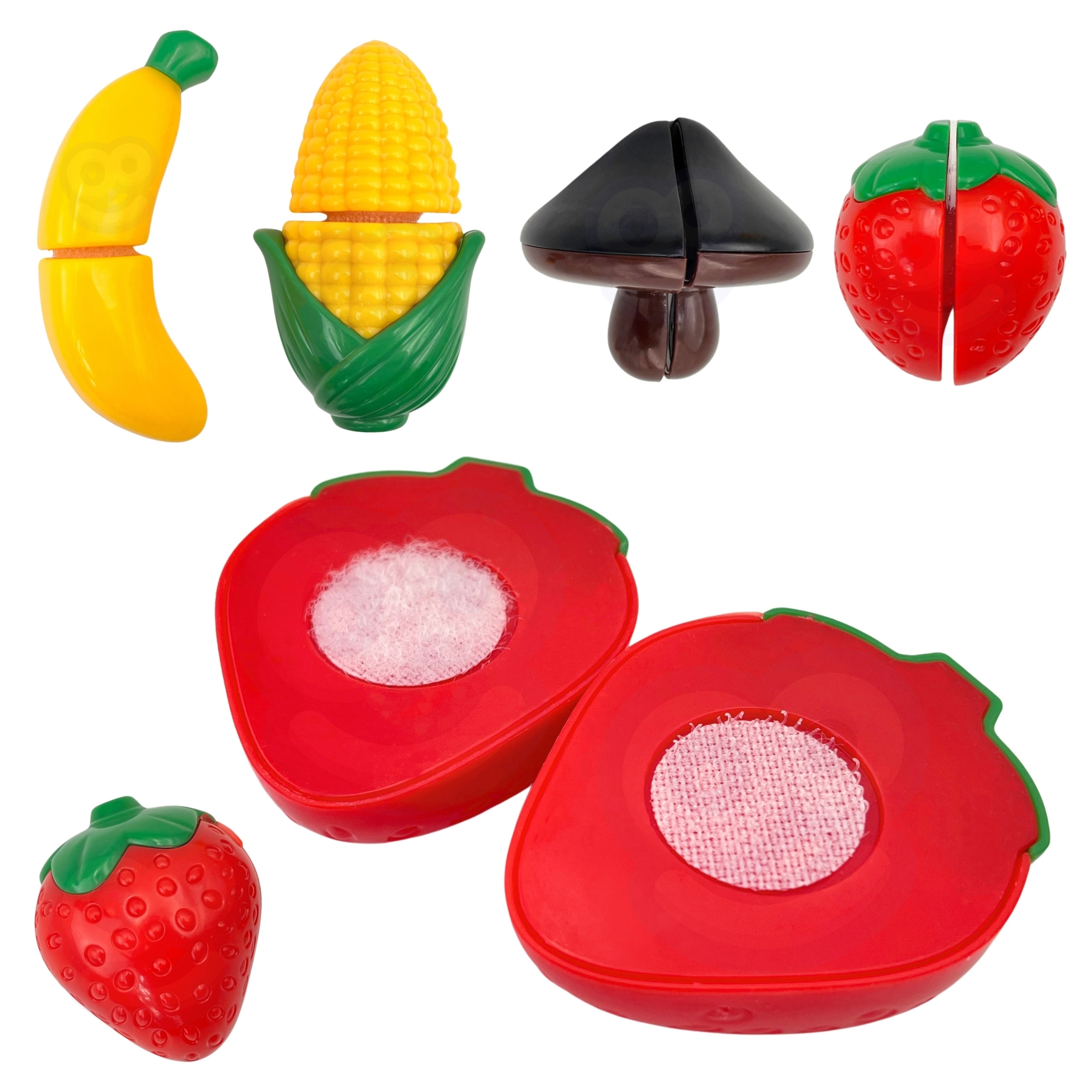 Lėkštutės, dubenėliai, puodeliai, stalo įrankiai, arbatinukas ir pjaustomi vaisiai bei daržovės su lipdukais – viskas tikroviškam patiekimui ir tvarkymui po puotos.
