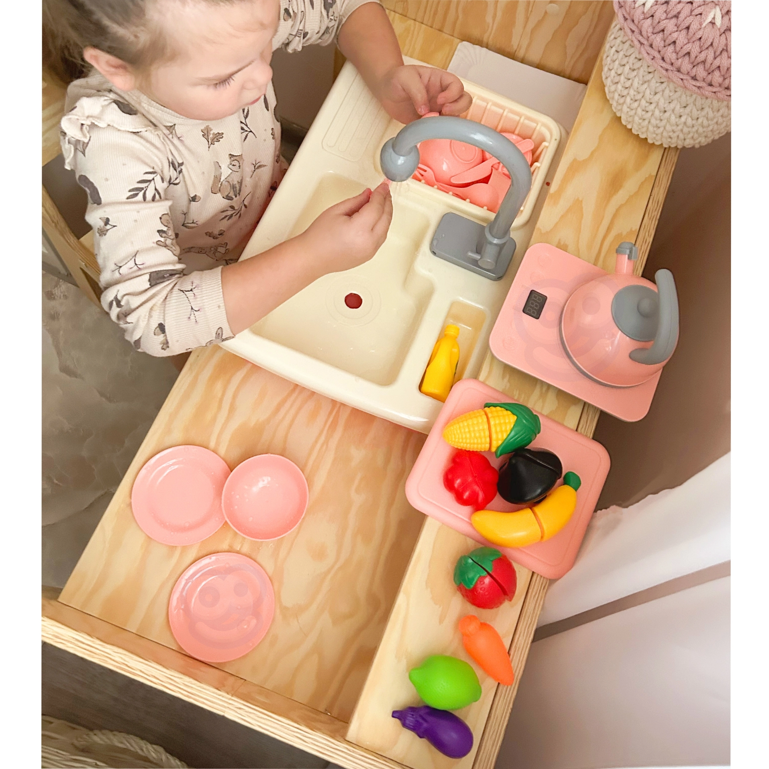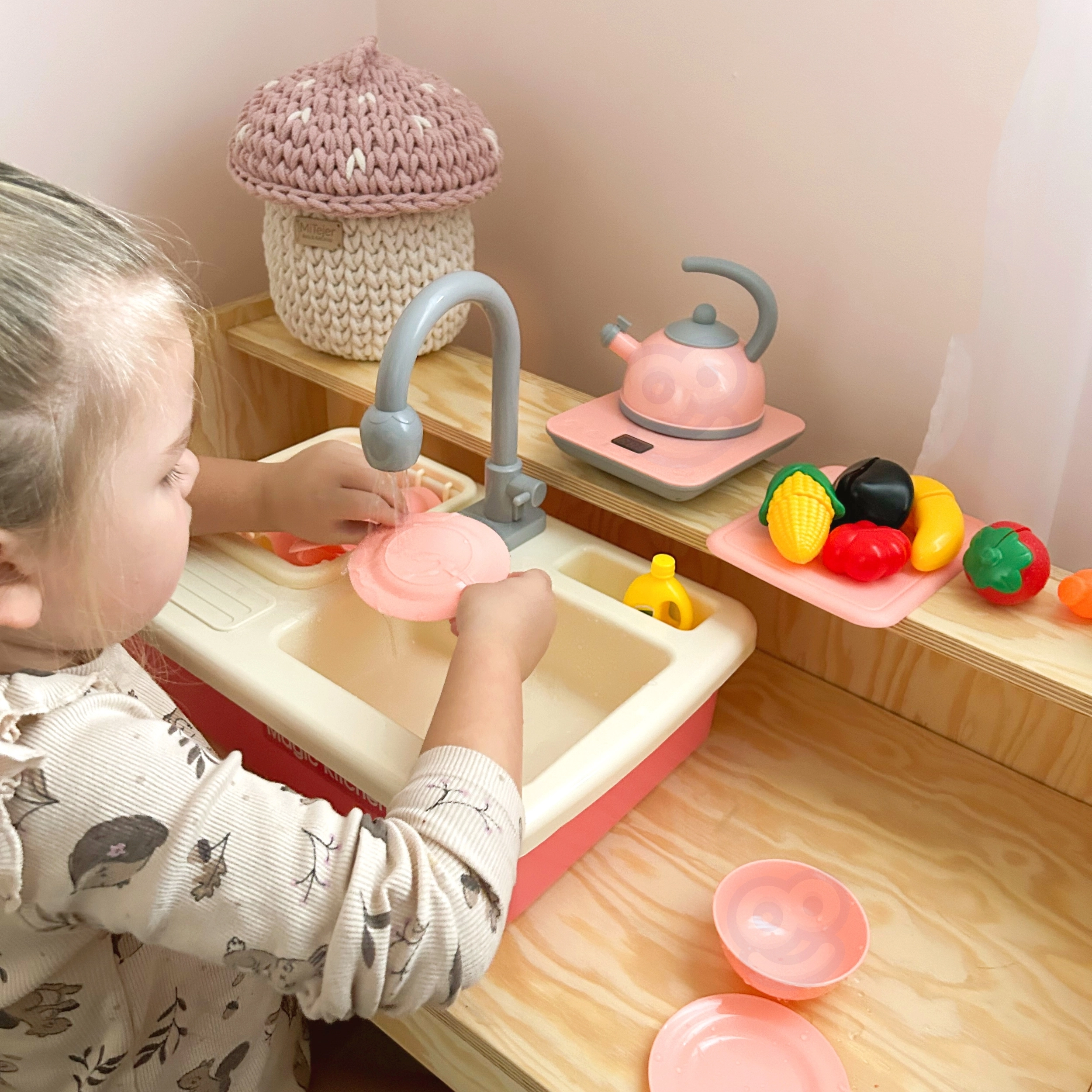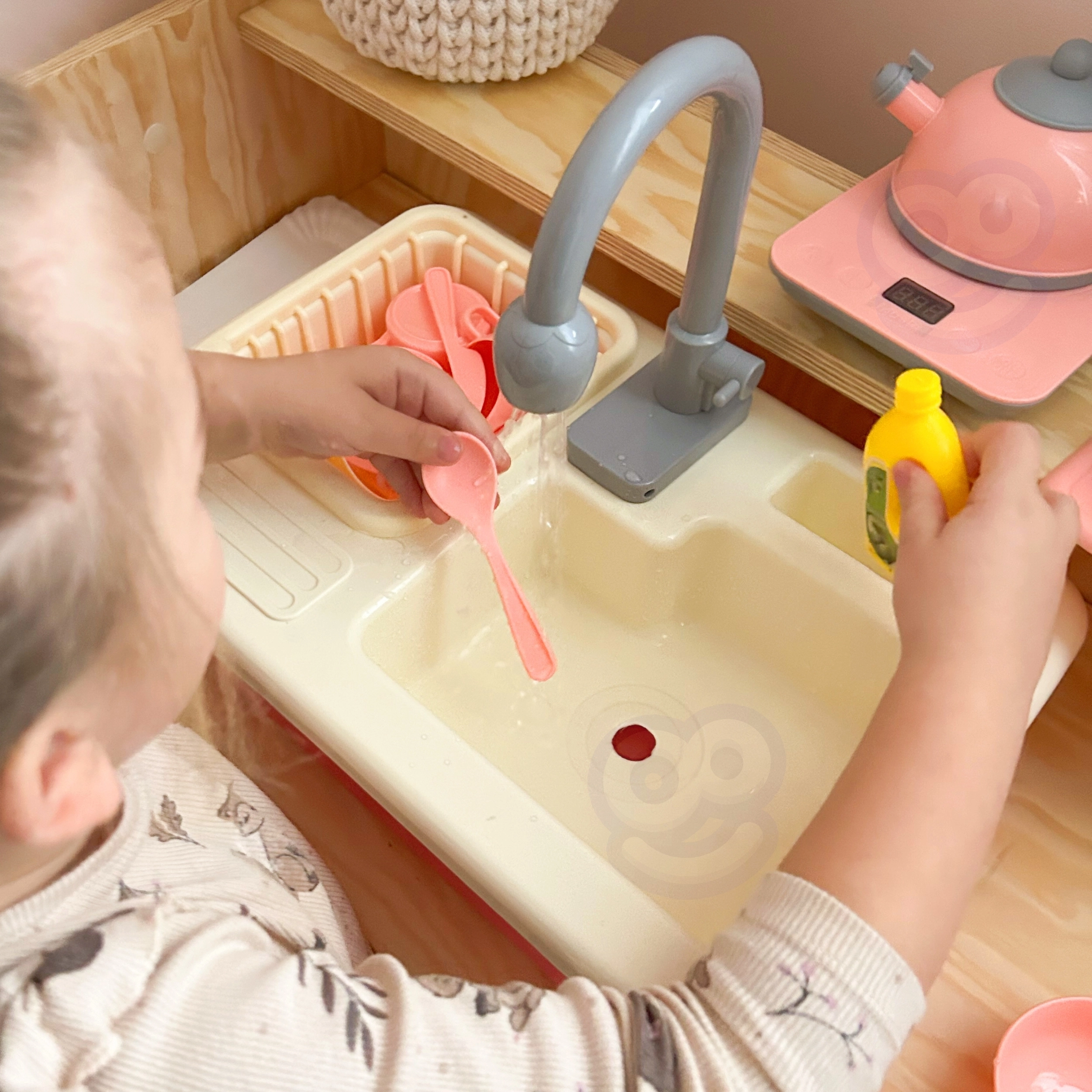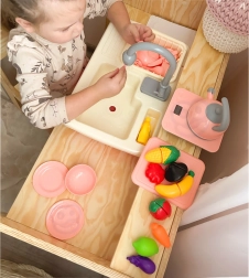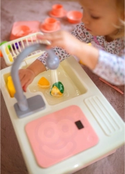 Vaikai lengvai suvaidins virėjus ir namų pagalbininkus: serviruos, pjaustys, plaus ir tvarkys. Taip jie natūraliai įsisavina higienos pagrindus ir ekologišką požiūrį į vandenį, o tėvai įvertins tvarkingesnį žaidimų kampelį.