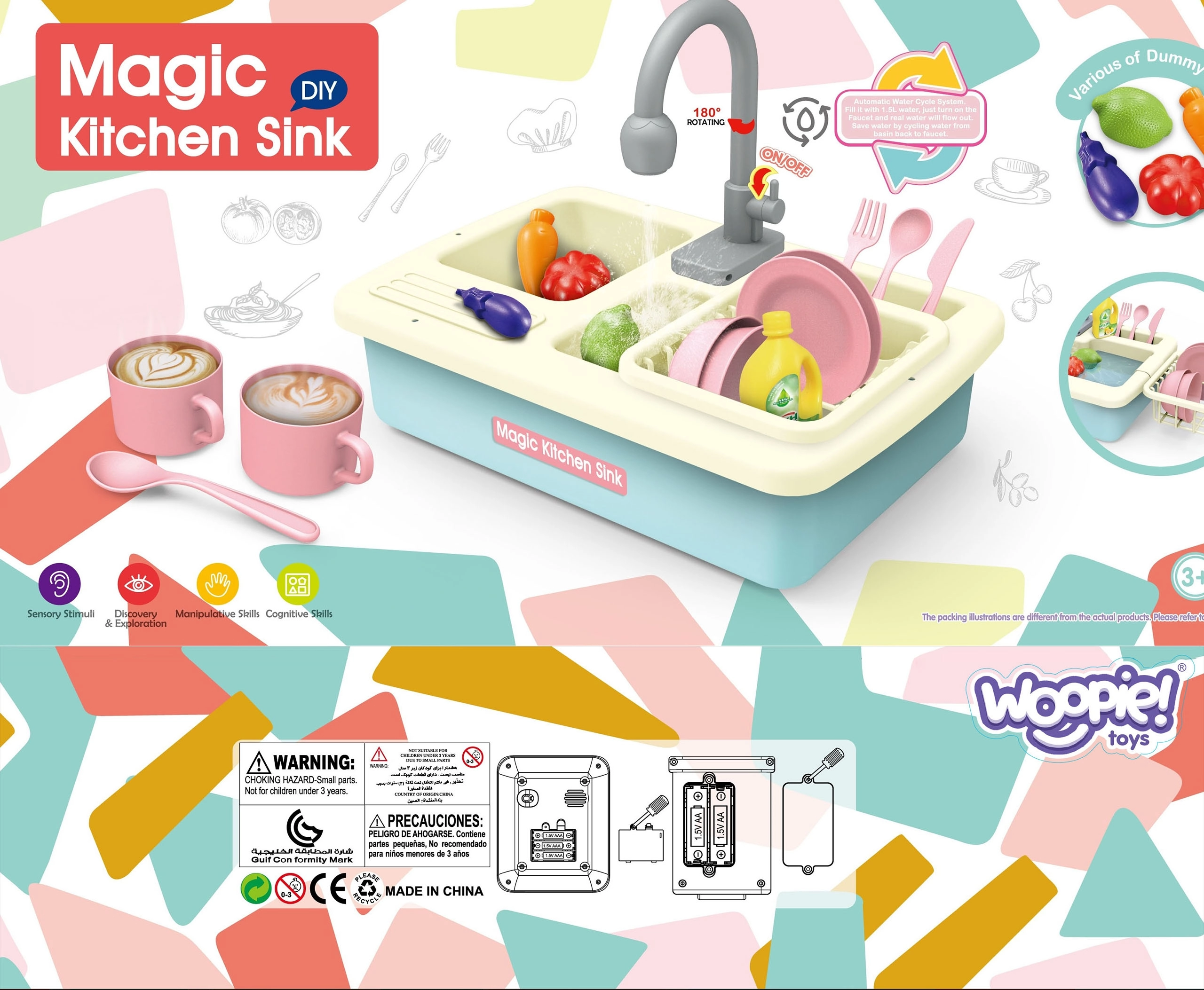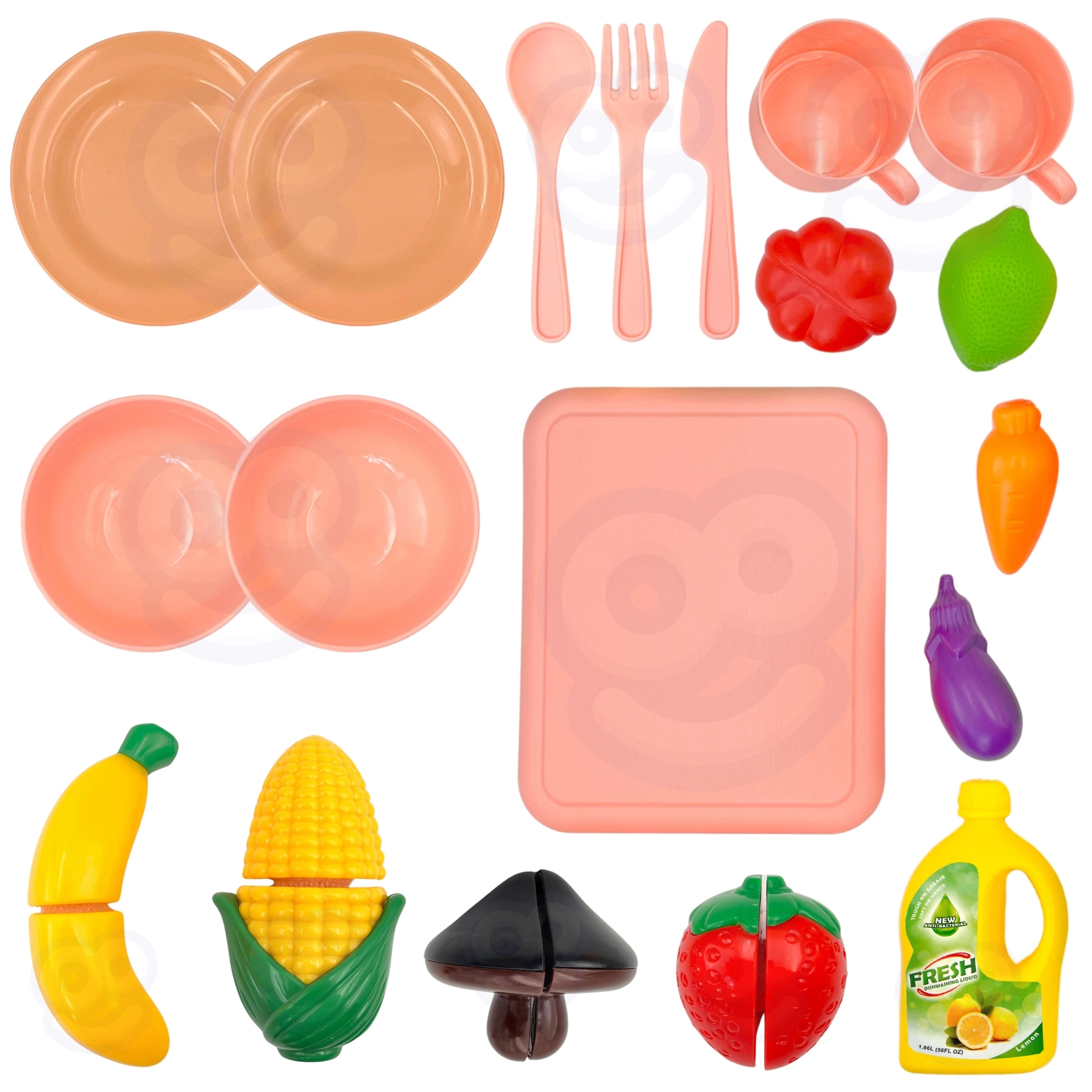 Susipažinkite su interaktyvia kriaukle, kuri įdėjus 2× AA baterijas įjungia vandens cirkuliuojantį siurblį – vaikai gali „iš tikrųjų“ plauti indus, skalauti vaisius ir mokytis tausoti vandenį. Gausus indų, pjaustomų produktų su lipdukais ir virtuvės priedų rinkinys lavina vaizduotę ir koordinacijos įgūdžius.