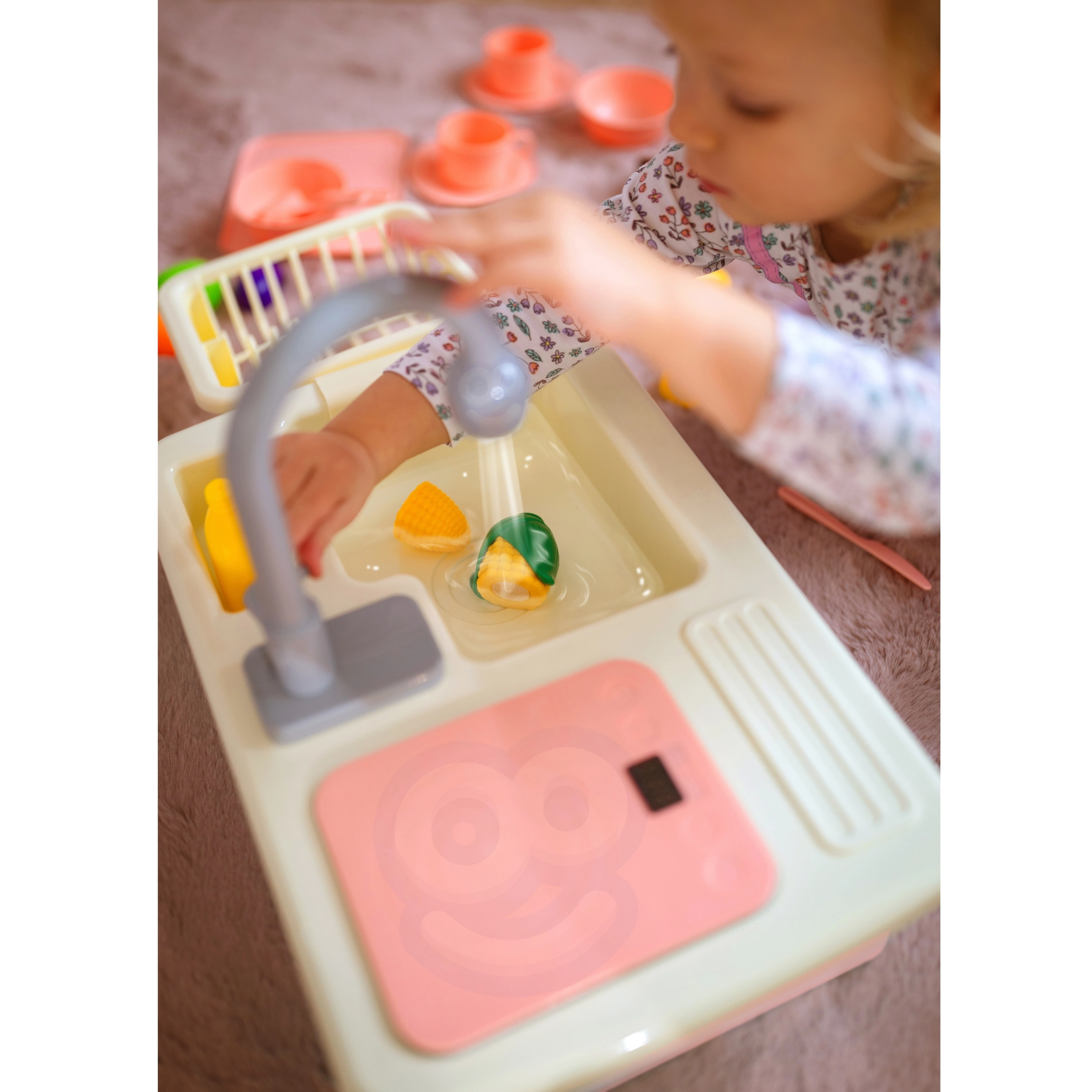 Įdėjus 2× AA baterijas siurblys pradeda cirkuliuoti vandenį. Vaikai žaismingai pasipraktikuos plauti indus, skalauti ir taupiai naudoti vandenį.