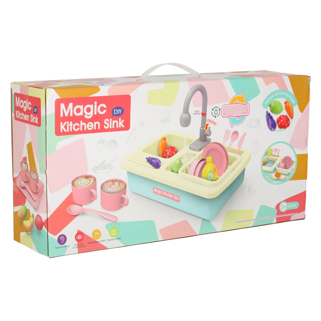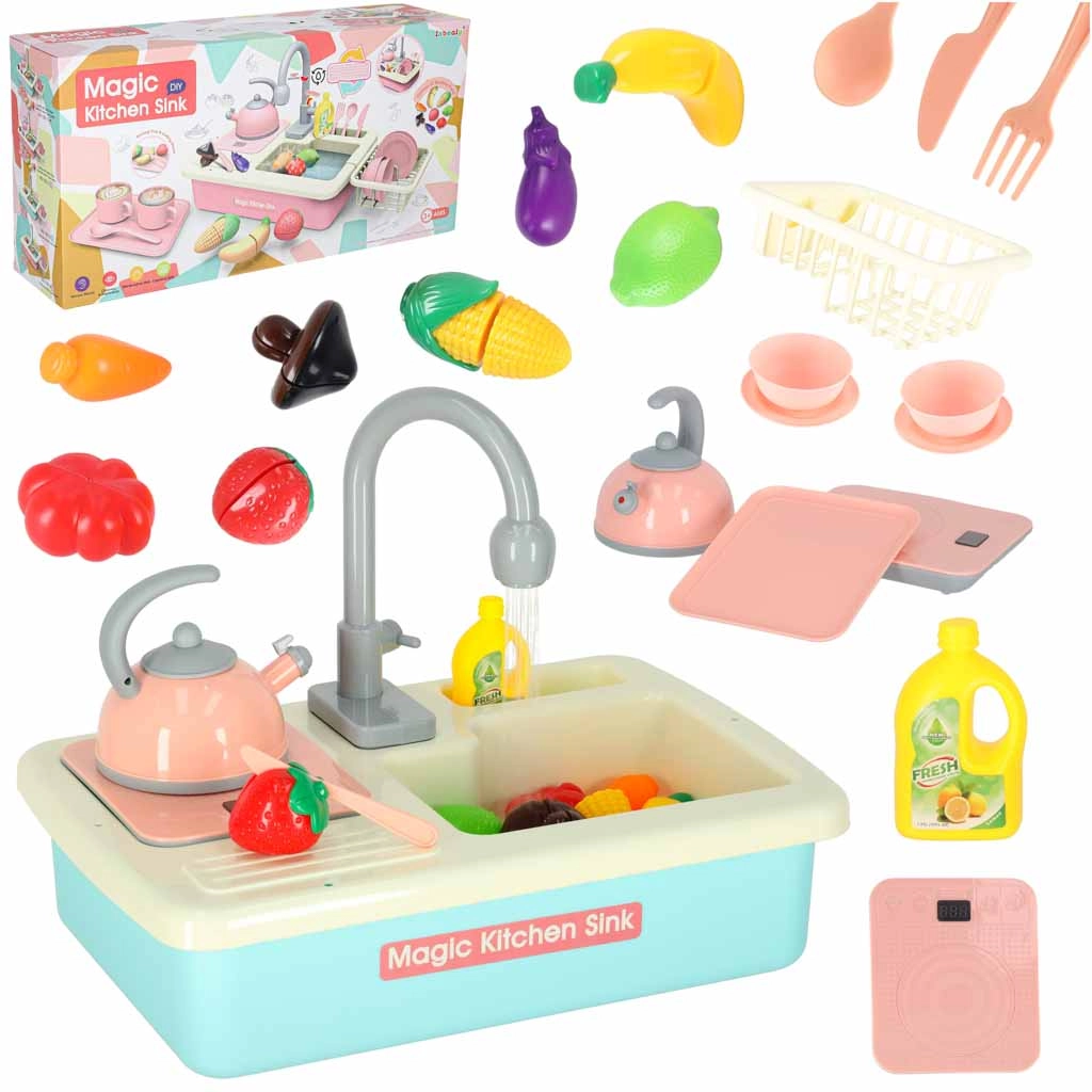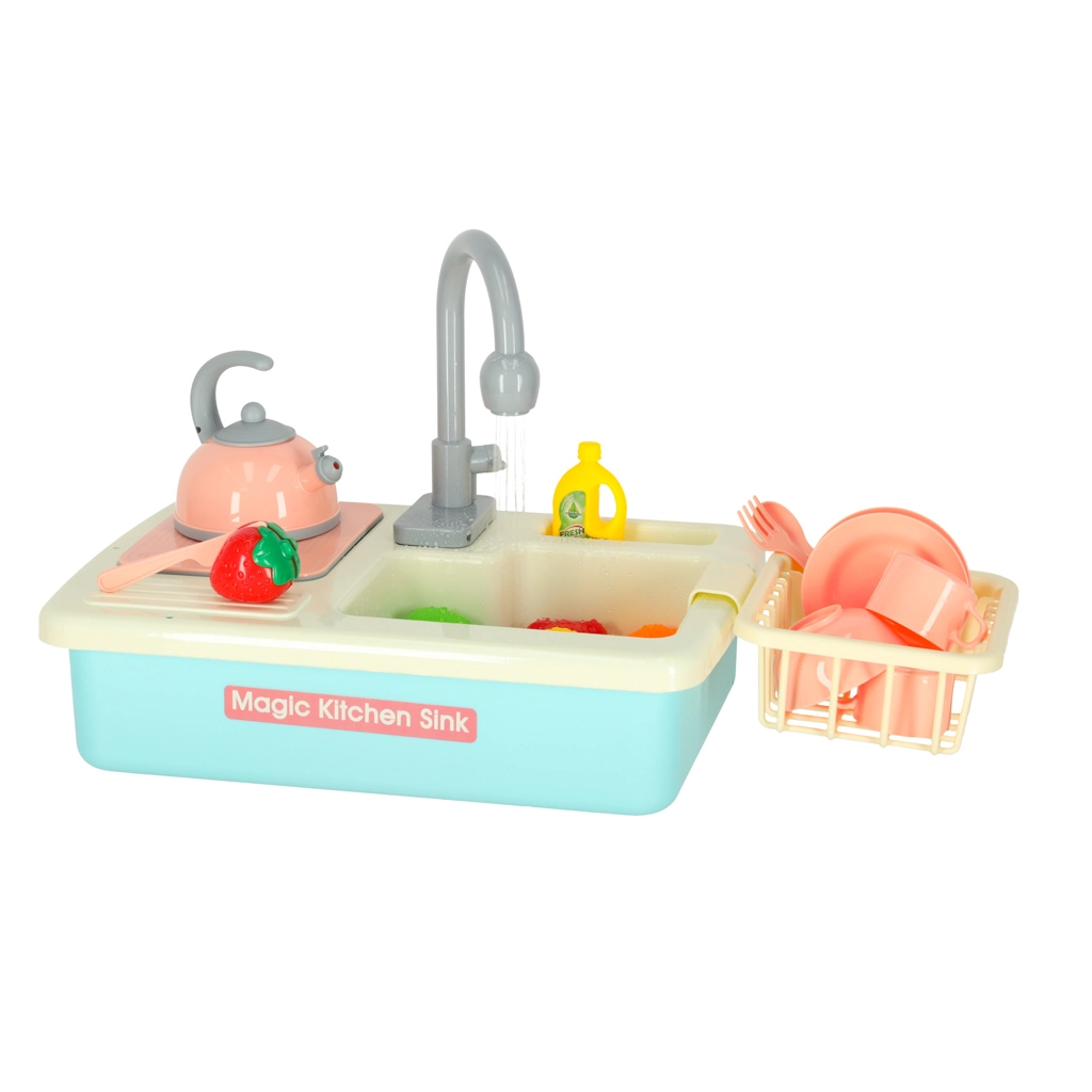 Ši realistiška vaikiška kriauklė veikia beveik kaip tikra – įdėjus baterijas siurblys paleidžia vandens cirkuliaciją, todėl vaikai gali plauti indus ir mokytis atsakomybės virtuvėje. Žaidimas kartu natūraliai ugdo vandens taupymo įpročius ir skatina praktinius įgūdžius.