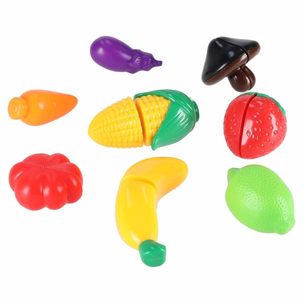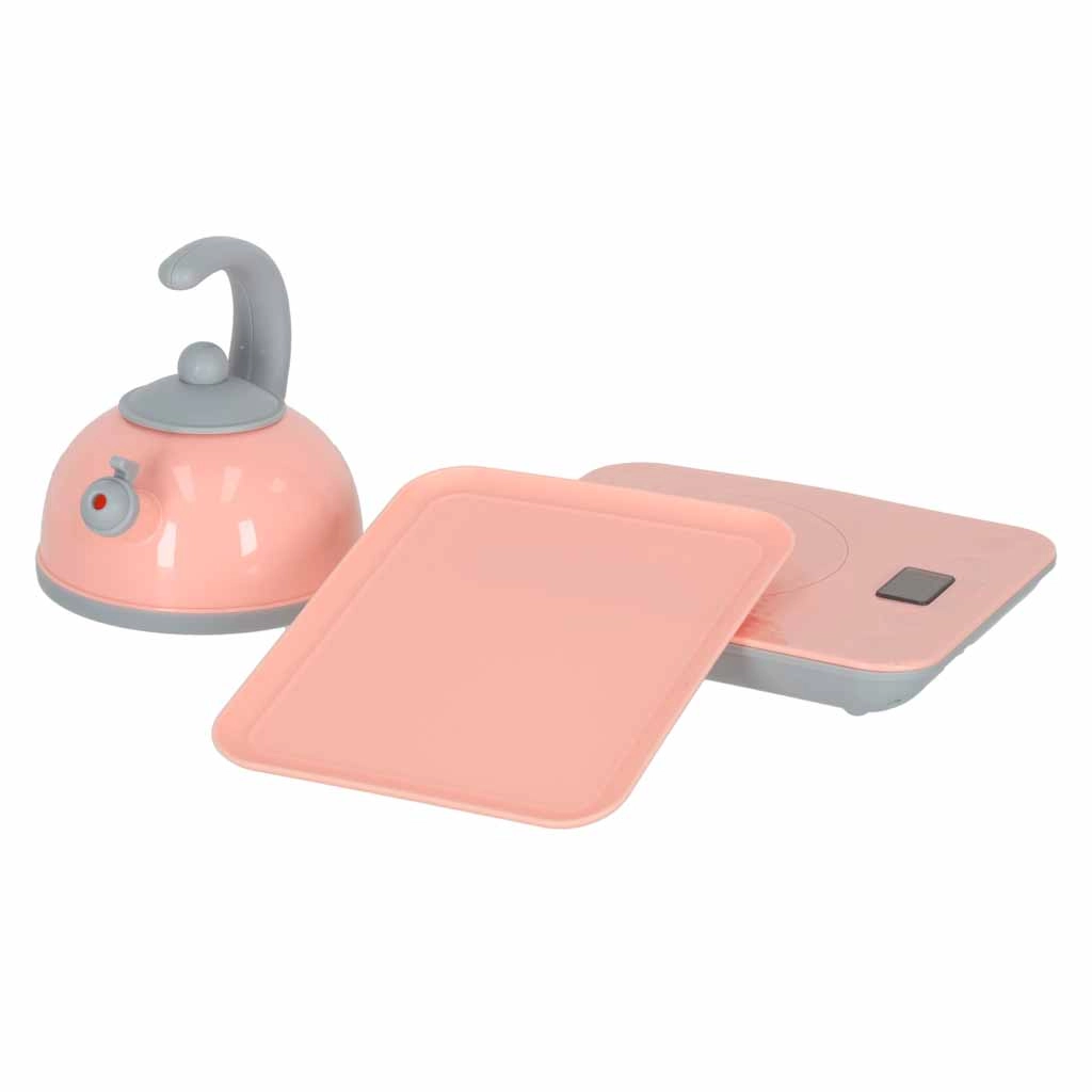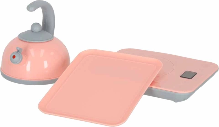 - kriauklė, „virtiuvėlės kaitlentė/virtuvėlė“, arbatinukas, pjaustymo lentelė, 2× dubenėlis, 2× lėkštė, 2× puodelis, stalo įrankiai (šaukštas, šakutė, peilis), plastikiniai priedai ir maisto produktai (pvz., pomidoras, laimas, baklažanas, bananas, braškė, kukurūzas, grybas, morka)