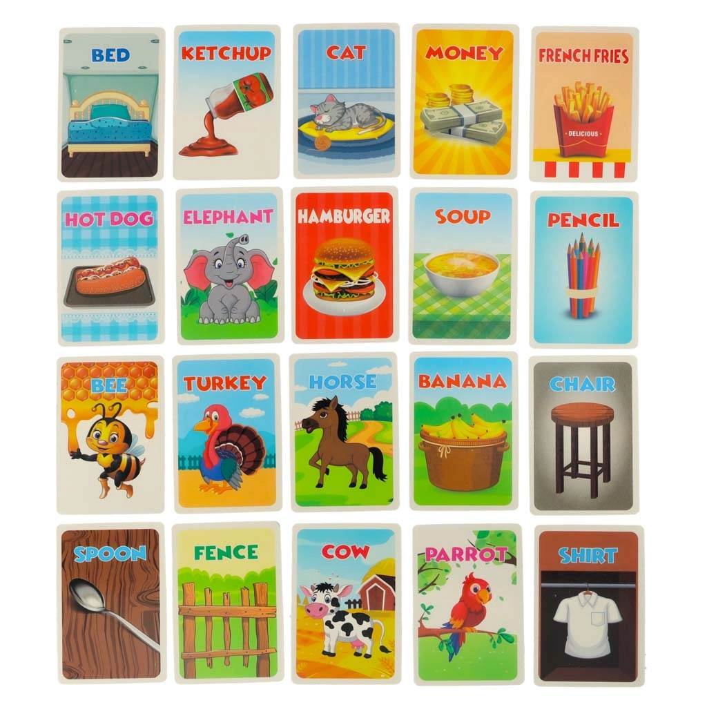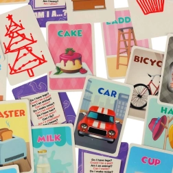 Rinkinyje yra 42 kortelės su įvairiais paveikslėliais ir angliškais užrašais. Papildomai pridedamos 8 tuščios kortelės, skirtos susikurti savo mįslių korteles. Kiekvieno raundo laiką matuoja smėlio laikrodis, suteikdamas žaidimui dinamikos ir azarto.