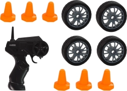 Pakuotėje yra keičiami ratai driftui ir įprastam važiavimui bei kūgeliai savo trasoms statyti. Rinkinyje taip pat yra 3,7 V akumuliatorius ir USB įkroviklis, tad galėsite startuoti beveik iškart po išpakavimo.