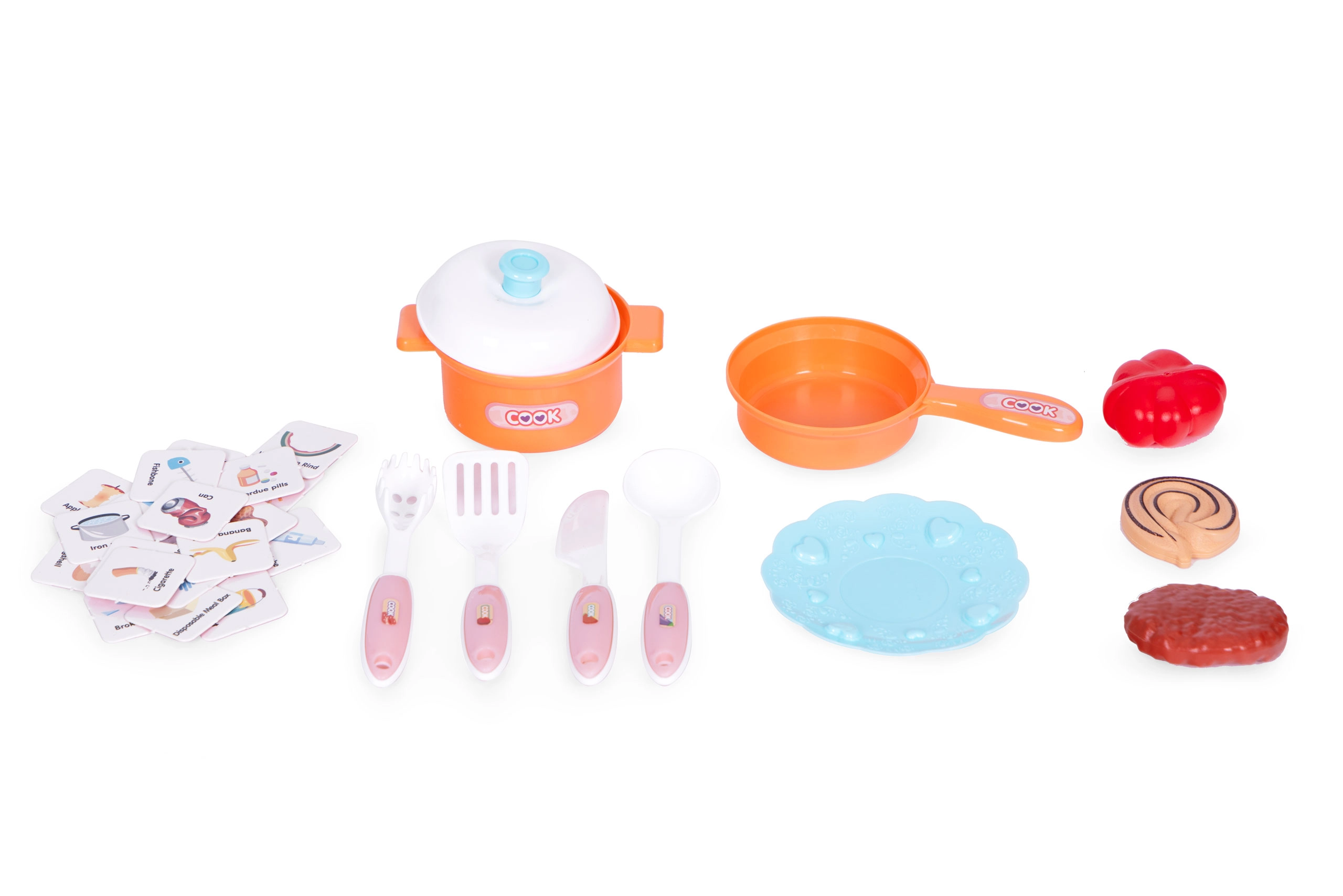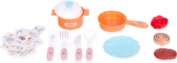 Puodai, keptuvė, lėkštės, stalo įrankiai ir maisto produktai papildyti dėlione, kuri moko teisingai rūšiuoti atliekas – mokymasis derinamas su pramoga.