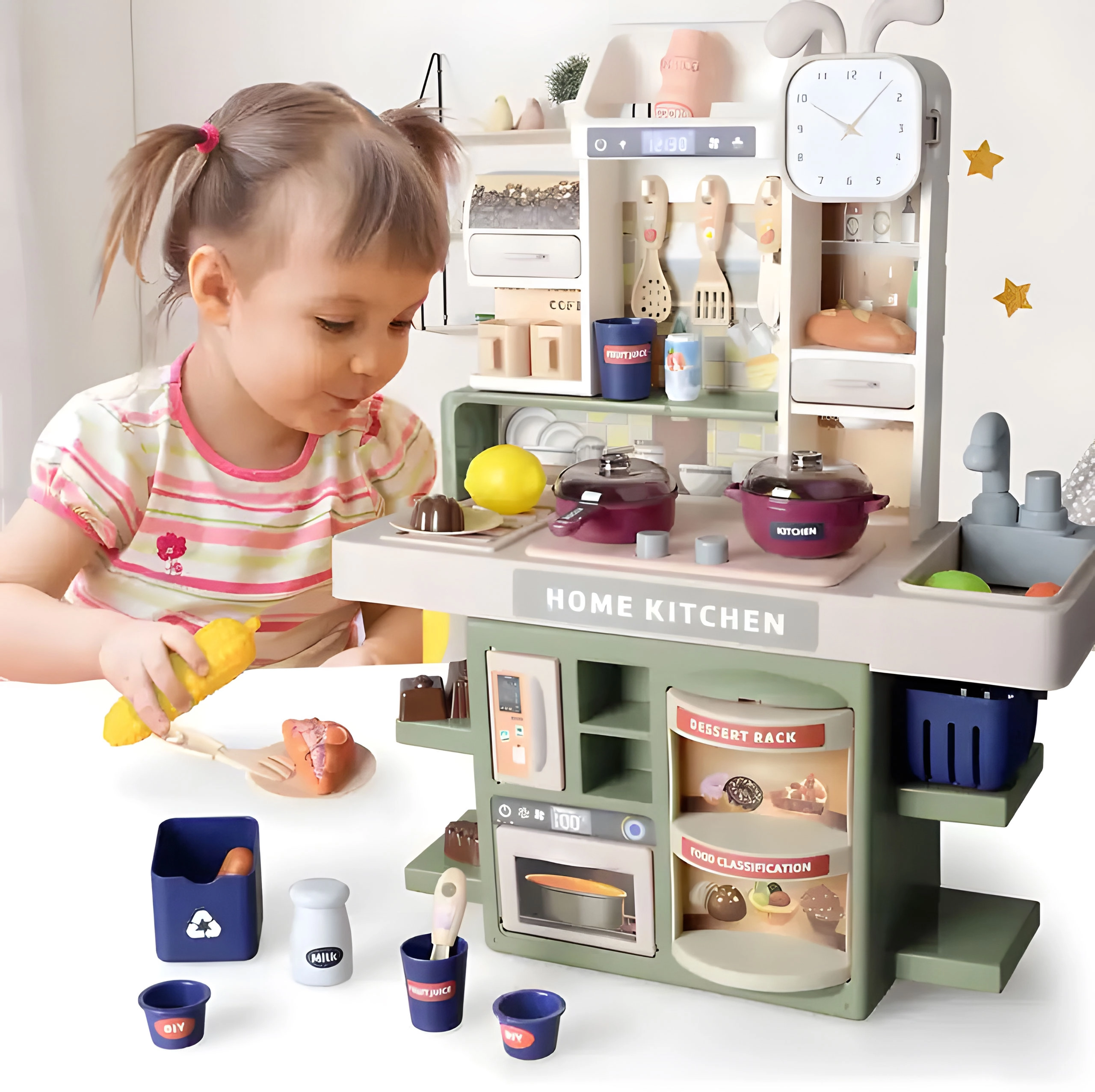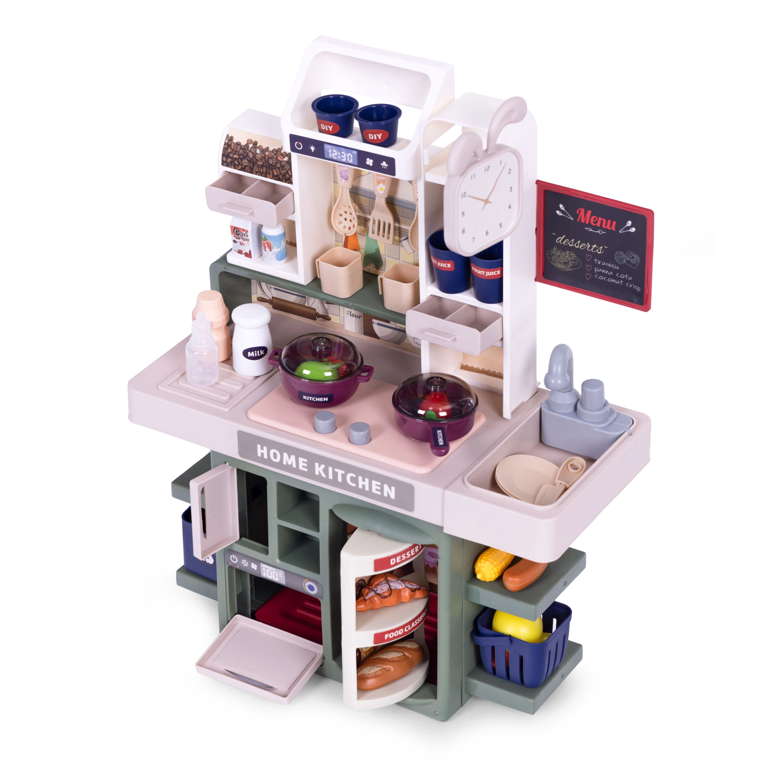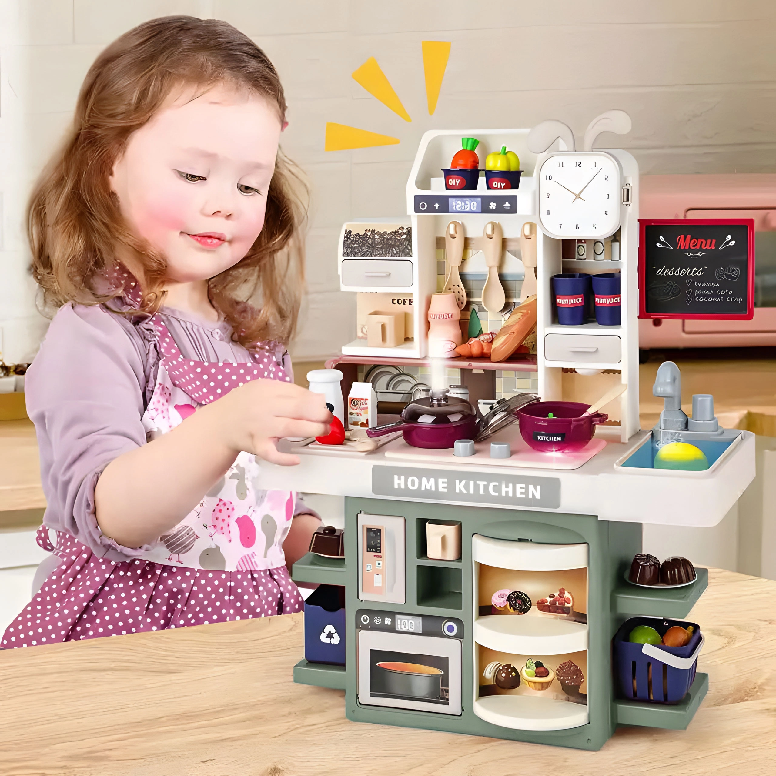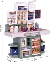 Ši stilinga virtuvėlė ištikimai atkuria tikrą virtuvę – nuo šviečiančių kaitlenčių su raudonomis LED ir verdamo vandens garsu iki iš puodo kylančių garų. Tereikia įpilti vandens į tam skirtą kaitlentę ir po dangčiu netrukus pasirodys garai. Dėl veikiančios kriauklės su pompėle vaikai galės džiaugtis ir „tekėjančiu vandeniu“.