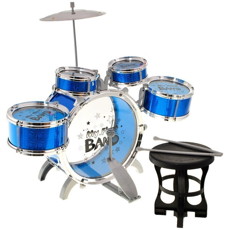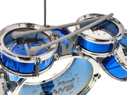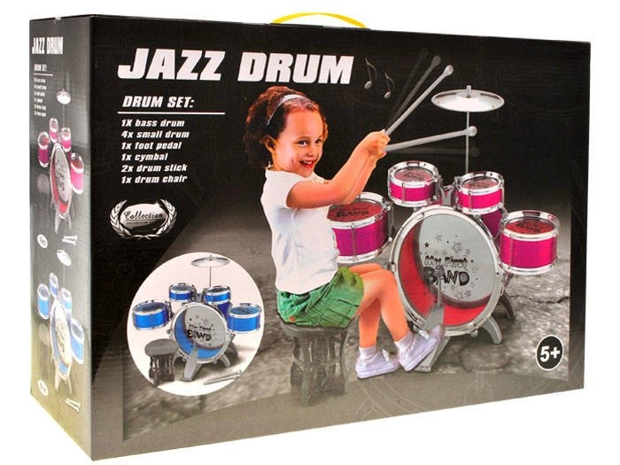 Rinkinyje yra 5 būgnai, lėkštė, pedalas, kėdutė ir 2 lazdelės – viskas, ko reikia mažajam pradedančiajam groti.