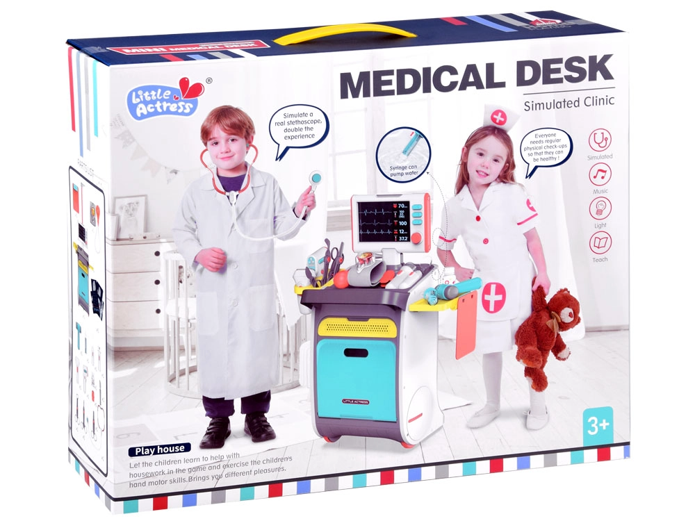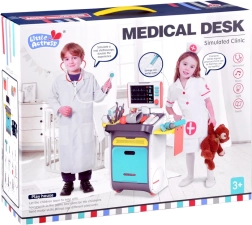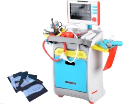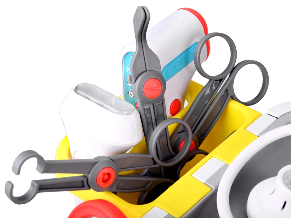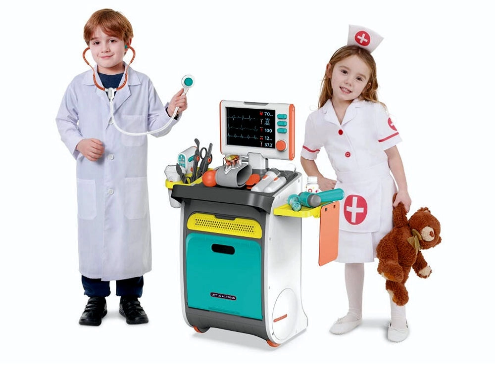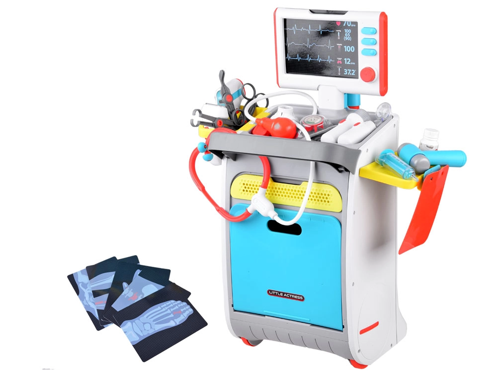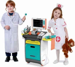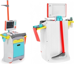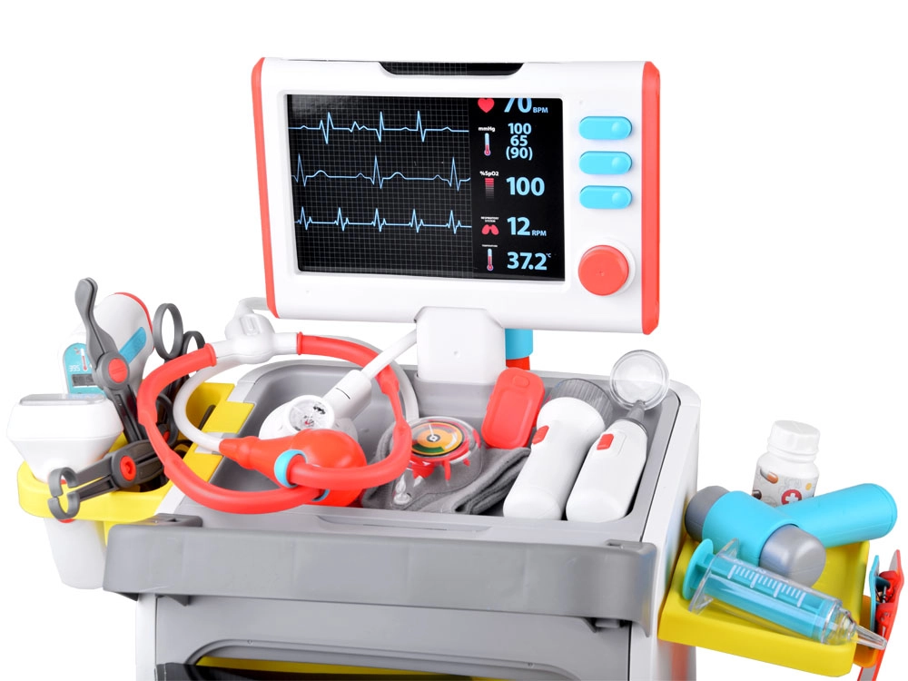 Pilnas vaikų medicininis rinkinys ant ratukais riedančio vežimėlio suteikia realistišką gydytojo žaidimą jau nuo 3 metų. Įtraukti interaktyvūs įrankiai, EKG/RTG monitorius su garsu, plovimo indelis ir įrankių sterilizatorius, laikymo lentynos ir stalčiukai bei ūgio matuoklis iki 112 cm. Tvirtas atlikimas ir ryškios spalvos skatina kūrybišką ir mokomąjį žaidimą.