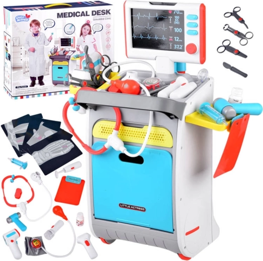Vaikiškas medicininis vežimėlis – puikiai sukomplektuotas rinkinys mažiesiems medikams. Dėl realistiškų funkcijų, tokių kaip EKG/RTG monitorius su garsu, ūgio matuoklis ir vieta įrankiams, vaikai lengvai įsijaučia į gydytojo vaidmenį. Aukštos kokybės plastikas ir paprastas valdymas dėka ratukų užtikrina valandas saugaus ir kūrybiško žaidimo.