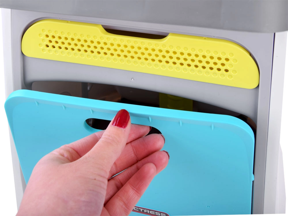 Trys ratukai, lentynos, skyreliai ir įrankių dėžutė padeda viską laikyti tvarkingai ir po ranka. Lengva perstumti po kambarį.