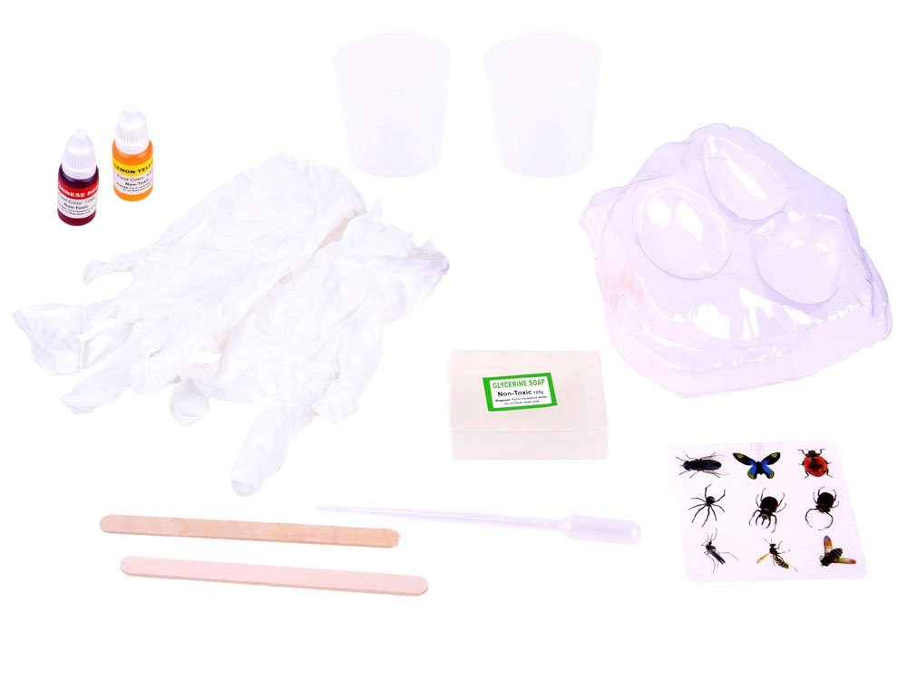 Į komplektą įeina visa reikalinga įranga gintarui gaminti, įskaitant muilo pagrindus, dažus ir formas.