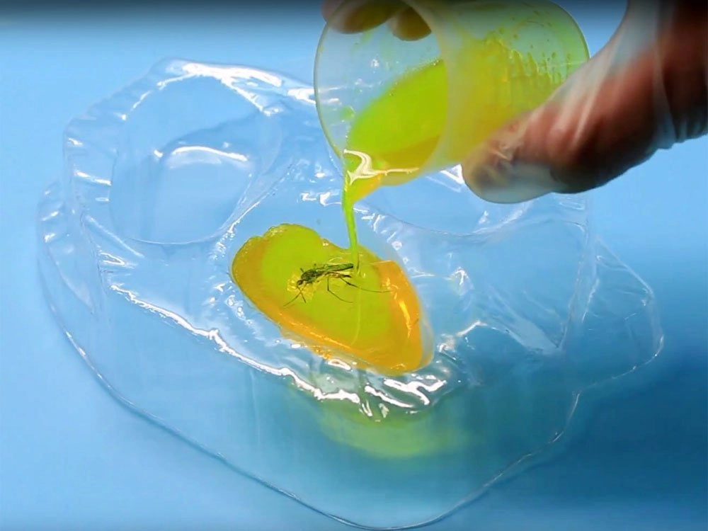 Parodykite savo baigtą kūrinį – nuosavą gintarą su įdėtu vabzdžiu ir dekoratyviniais motyvais.