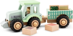 Šį gražų rinkinį sudaro švelniai žalios spalvos traktorius, nuimama priekaba ir keturios medinės kaladėlės su pomidorų, baklažanų, morkų ir brokolių atvaizdais. Vaikai gali krauti, vežti ir iškrauti daržoves, lavinti akių-rankų koordinaciją ir pažinti ūkininkų pasaulį.