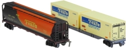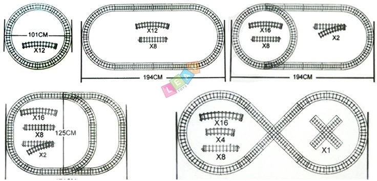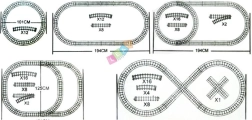 - Gausus rinkinys: lokomotyvas, 4 vagonai, medžiai, bėgiai ir atšakos