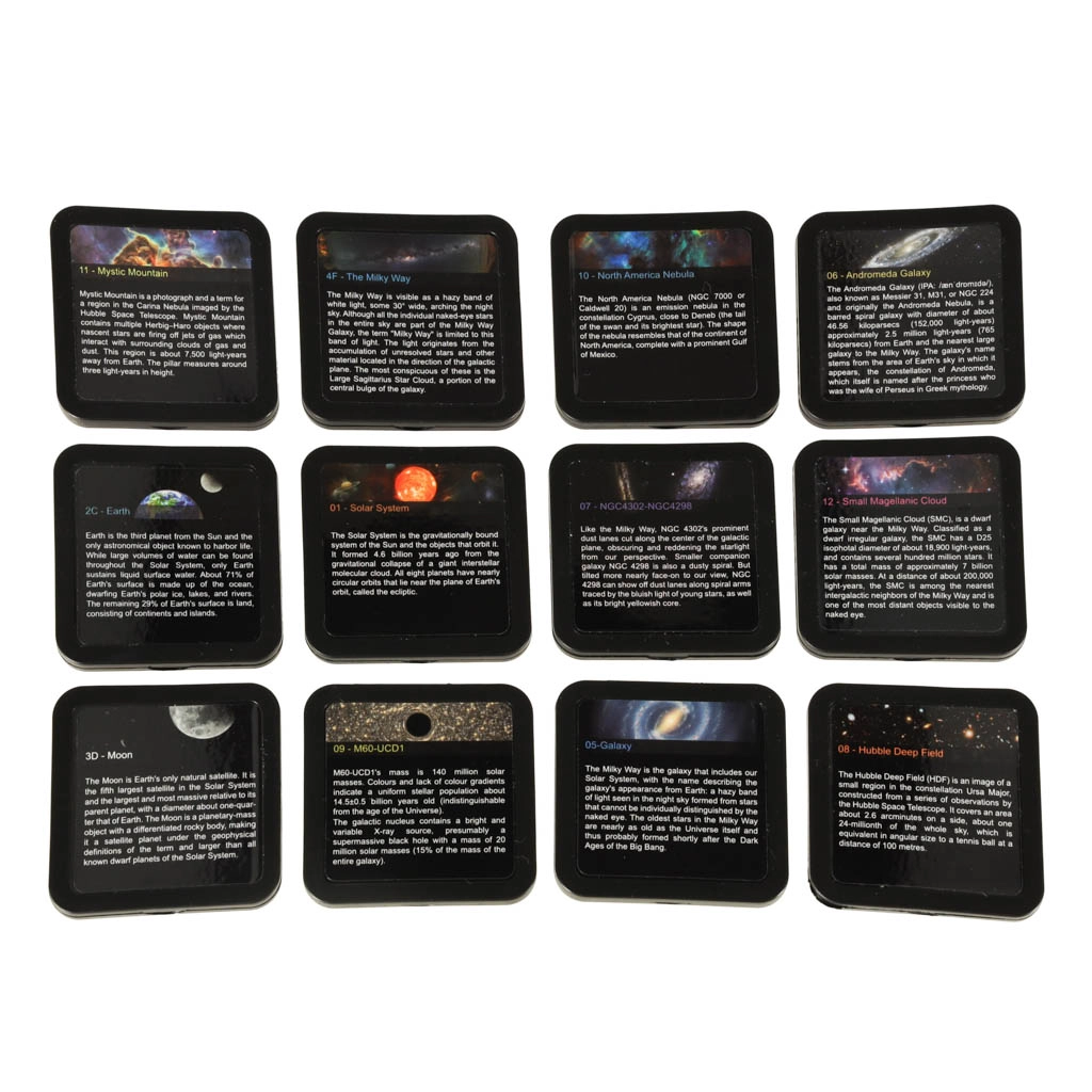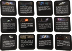 Plati motyvų kolekcija: Žemė, Mėnulis, Saulės sistema, galaktikos ir kita. Kiekvienas diskas su aprašymu ir trumpu paaiškinimu smagiam mokymuisi.