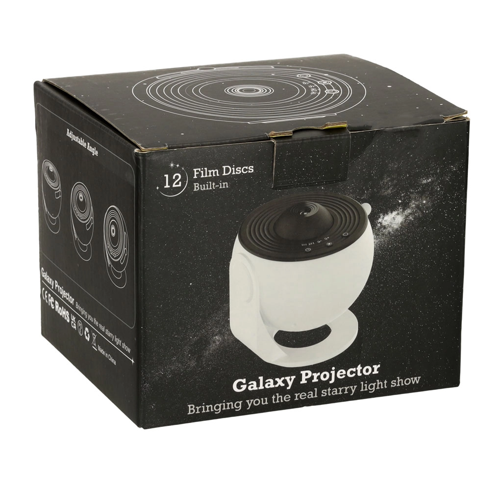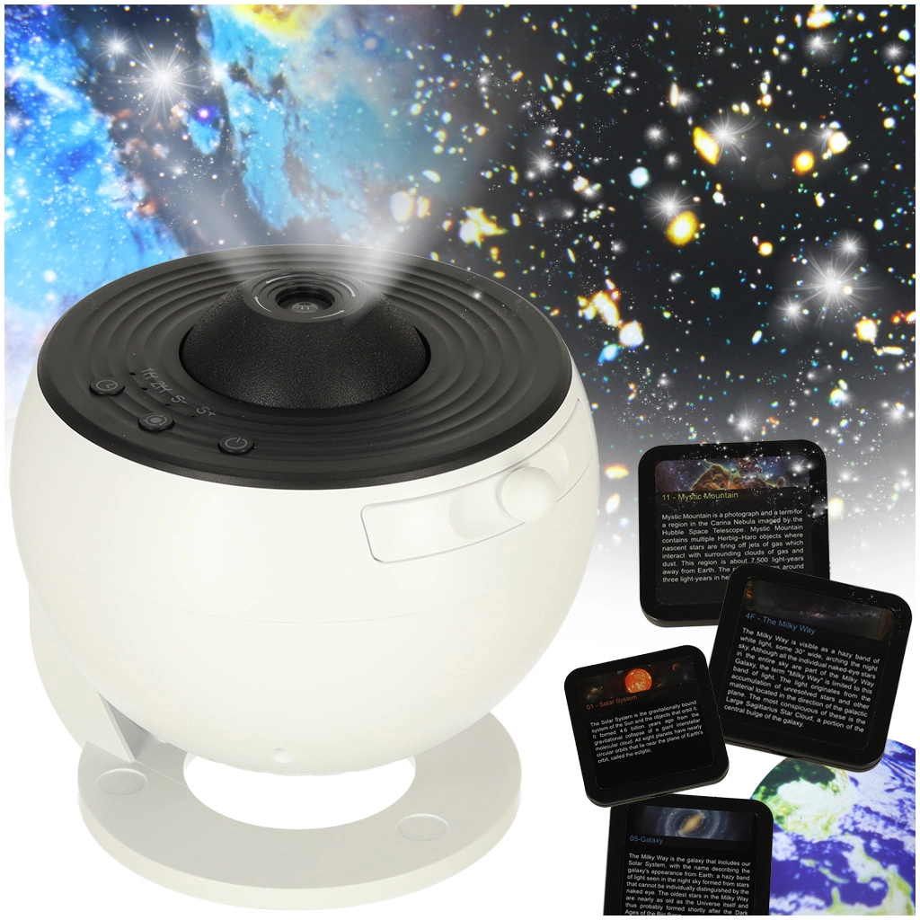 Perkelkite kosmoso magiją į namus ir projektuokite žvaigždes bei ūkus ant lubų ar sienos. Projektorius naudoja taupias LED lemputes, o dėl 12 vaizdinių diskų siūlo įvairią reginį – nuo Mėnulio detalių, Saulės sistemos iki Paukščių Tako. Kiekvienas diskas pažymėtas ir papildytas trumpu edukaciniu tekstu (EN), tad ir pramoga, ir žinios.