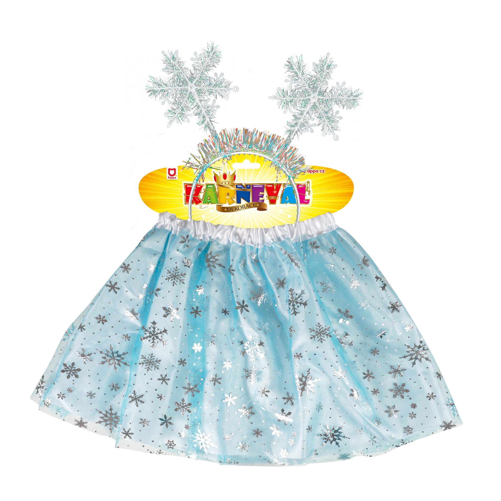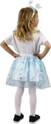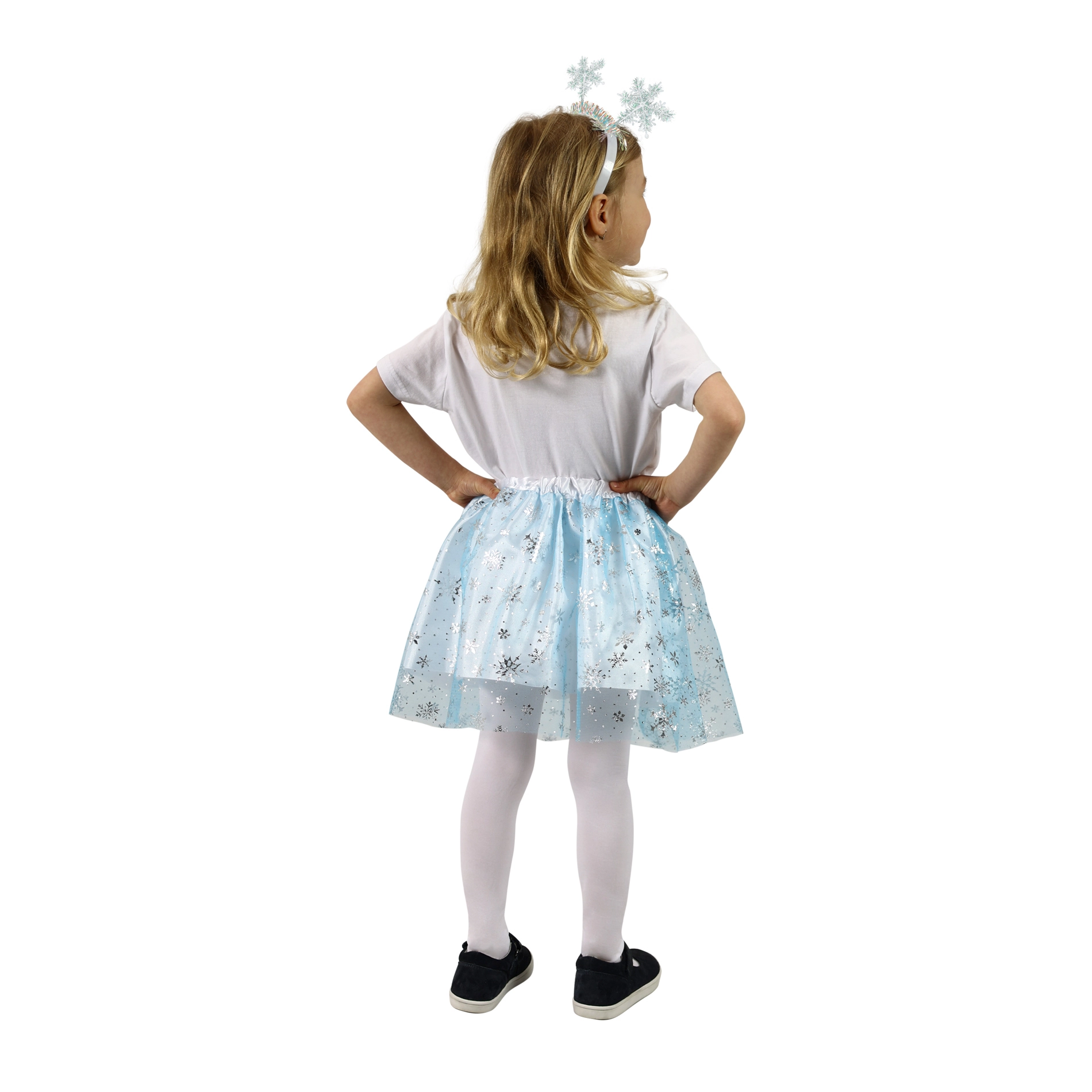 Mėlynas sijonas su žėrinčiomis snaigėmis ir satino juosmeniu suteikia žiemos magijos.