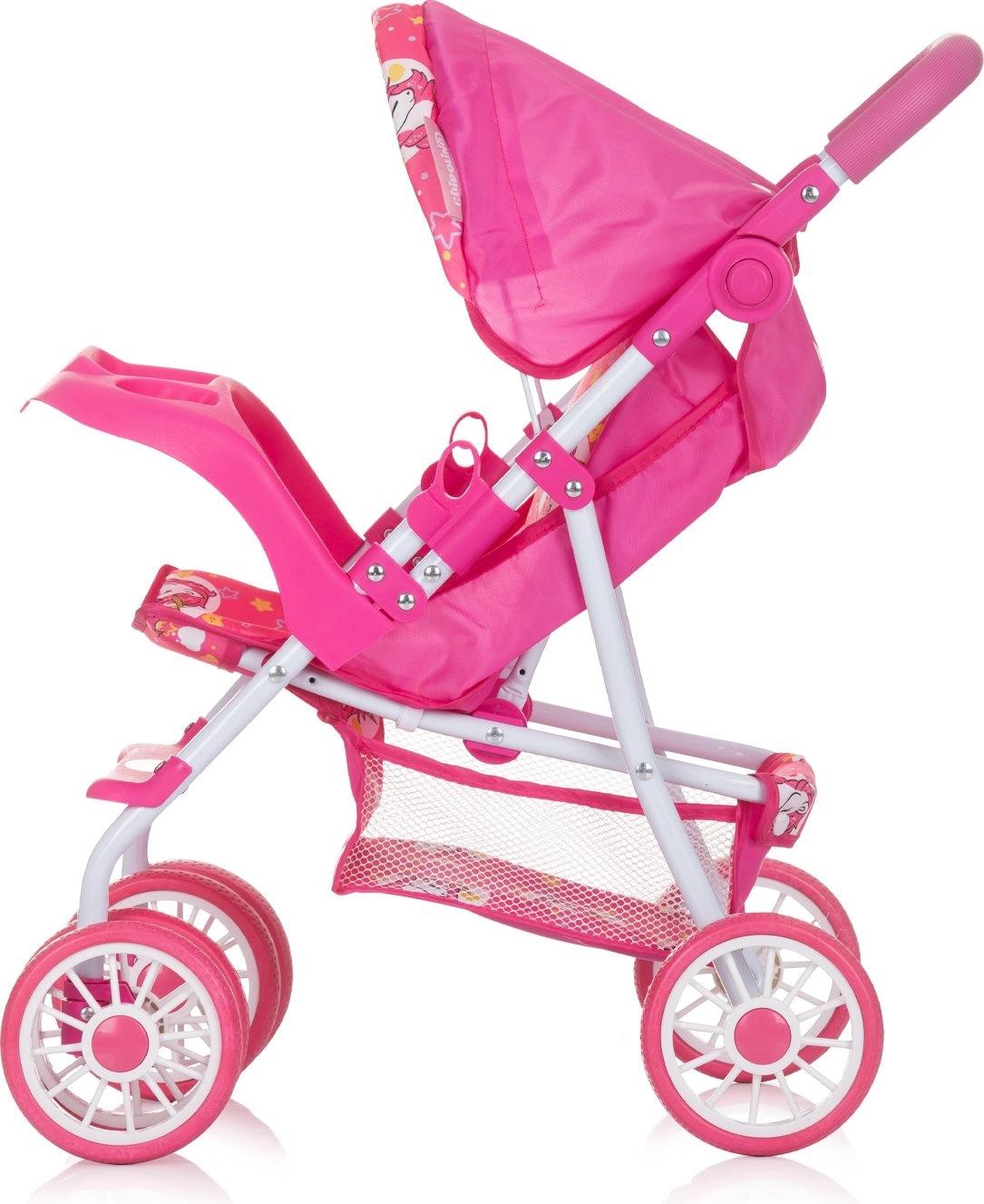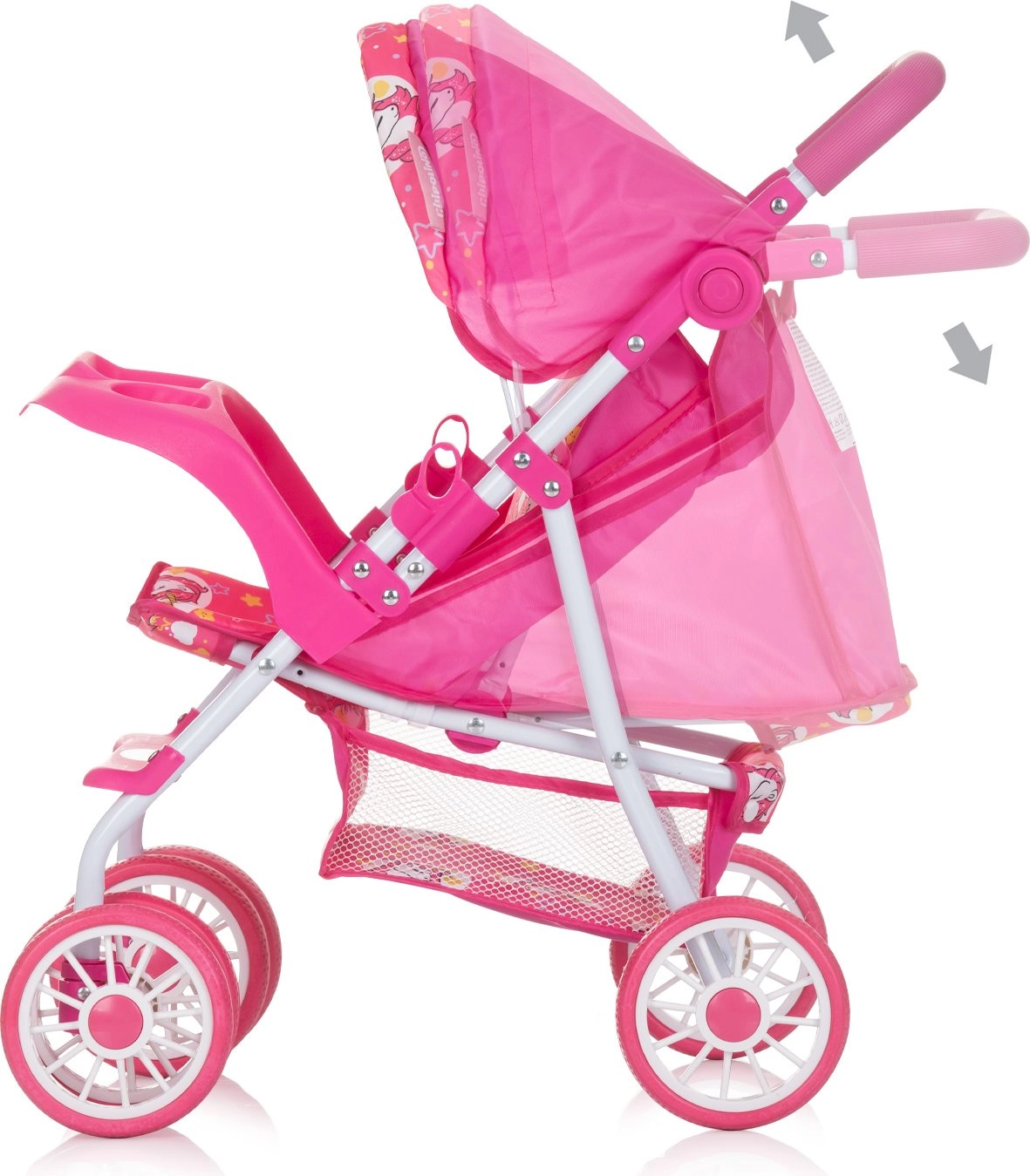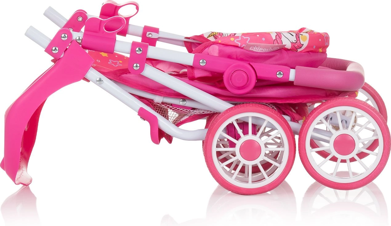 CHIPOLINO lėlių vežimėlis DOLLY UNICORNS yra puikus pasirinkimas kasdieniams žaidimams ir rūpinimosi įgūdžių lavinimui. Tvirtas metalinis rėmas su stabiliais dvigubais ratais užtikrina sklandų važiavimą, o reguliuojamas nugaros atlošas leidžia lėlei keliauti tiek sėdimoje, tiek gulimoje padėtyje. Reguliuojamas stogelis saugo nuo „saulės“ ir suteikia vežimėliui stiliaus.