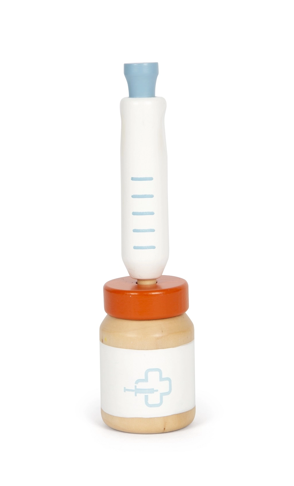 Medinė injekcija su spyruokliniu mechanizmu, vaistų dėžutė ir kitos priemonės padeda kurti autentišką augintinio priežiūros žaidimą.