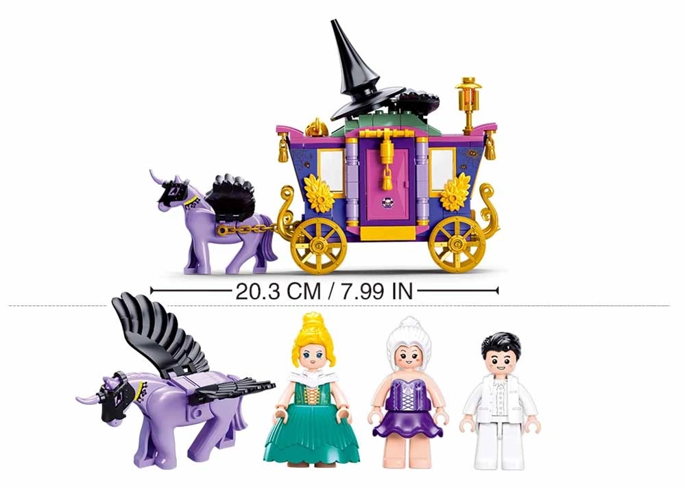 Pastatykite žavingą, detalią karietą ir leiskitės į pasakišką kelionę, kurią traukia violetinis vienaragis. Puikiai tinka kūrybiniams scenarijams ir vaidmenų žaidimams.