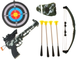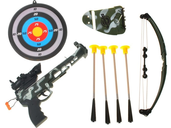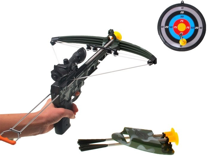- Arbaletas, taikinys, 4 strėlės su siurbtukais, dėklas strėlėms
