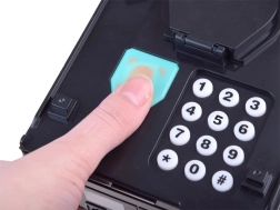 Įveskite keturių skaitmenų slaptažodį (numatytasis 0000) ir patvirtinkite jį palietę piršto atspaudo skaitytuvą (simuliacija). Teisingai atlikus veiksmus, seifo durelės automatiškai atsivers.
