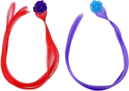 Rinkinyje yra dvi sintetinės sruogelės su gėlių formos segtukais – viena raudona su violetine rože ir kita violetinė su mėlyna rože.