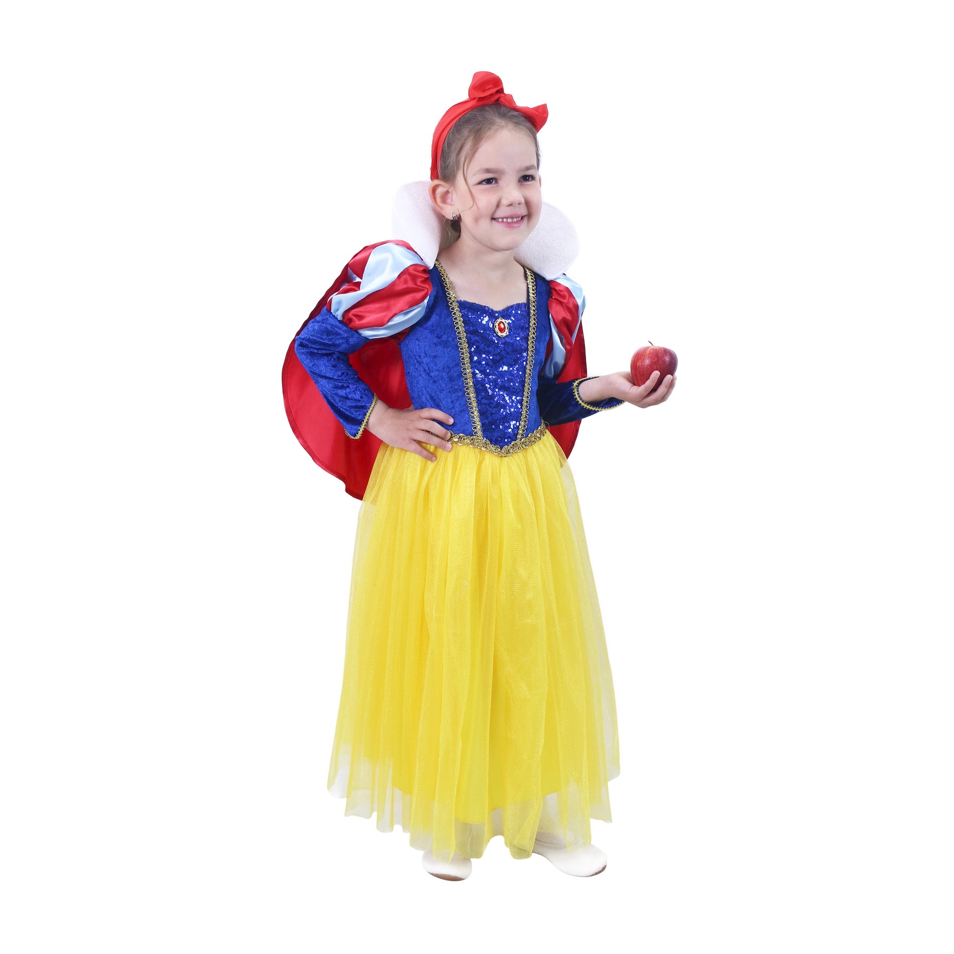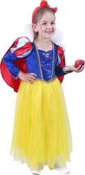 Mėlyna liemenė su auksiniais papuošimais, geltonas sijonas ir ikoniški raudoni akcentai sukuria tikros Snieguolės įspūdį. Puikiai tinka karnavalui ir žaidimams namuose.