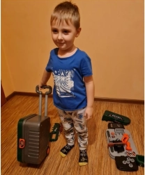 Darbo įrankiai, tokie kaip raktas, plaktukas ir pjūklas, atrodo lyg tikri, todėl skatina vaidmenų žaidimus ir kūrybiškumą.