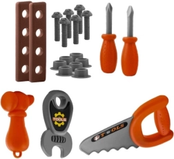- Rinkinį sudaro įvairūs įrankiai, įskaitant raktą, plaktuką ir pjūklą, kurie imituoja tikrus įrankius.