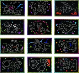 Atraskite kūrybišką pramogą patiems mažiausiems: rinkinys su spindinčiais grandomais paveikslėliais, kurių dydis 15 × 10 cm. Vietoje smulkių linijų grandymo yra nubraukiamas visas paveikslėlis – panašiai kaip trinama loterijos kortelė – ir išryškėja spalvoti, blizgūs motyvai, tinkami vaikams nuo 3 metų.
