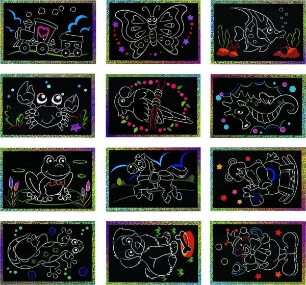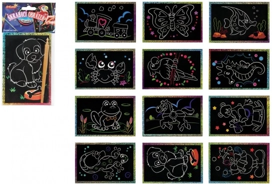 Šis grandomų paveikslėlių rinkinys – ideali pirmųjų kūrybinių bandymų pasirinktis. Paprastas viso motyvo nubraukimo principas be sudėtingų detalių vaikams lengvai suprantamas, o rezultatas matomas iškart: gražūs spindintys ir spalvoti paveikslėliai, kurie efektingai blizga.