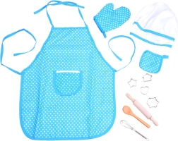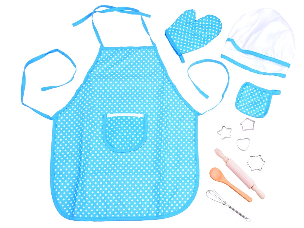 Žavus vaikiškas virtuvės rinkinys mažiesiems pagalbininkams virtuvėje saugo drabužius ir skatina vaikus gaminti bei kepti. Rinkinyje yra prijuostė, virėjo kepurė, pirštinė, padėkliukas ir praktiški įrankiai – kočėlas, medinis šaukštas, plakimo šluotelė ir metalinių sausainių formelių rinkinys. Puikiai tinka bendram gaminimui, vaizduotei lavinti ir profesionalų žaidimams.