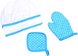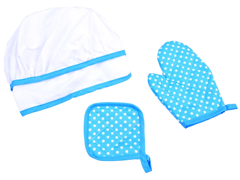 Kepurė su gumele, prijuostė su kišene ir karščiui atspari pirštinė su padėkliuku saugo drabužius ir rankas, o vaikai jaučiasi kaip tikri virėjai.