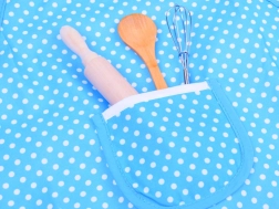 - Prijuostė, virėjo kepurė, pirštinė, tekstilinis padėkliukas, medinis kočėlas, medinis šaukštas, metalinė plakimo šluotelė, 4 metalinės formelės